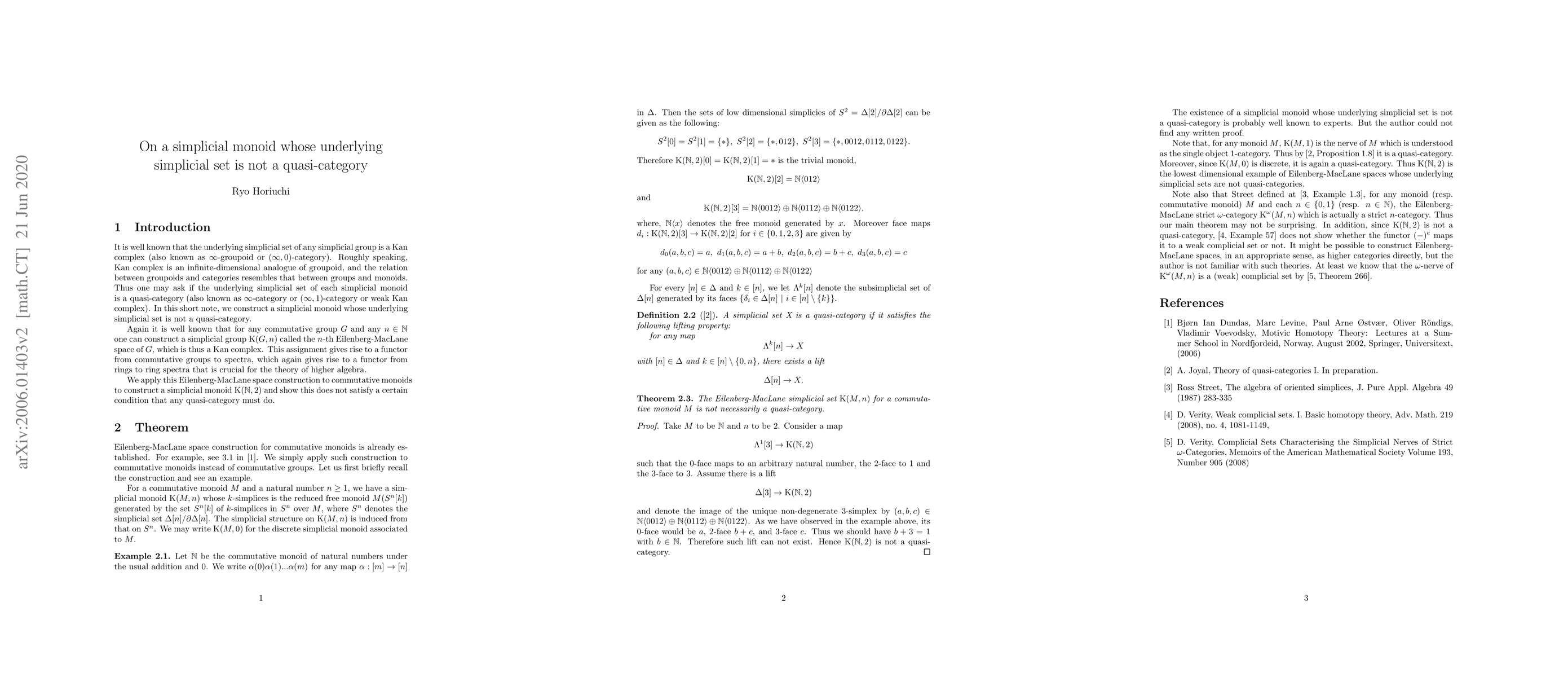 It is well known that the underlying simplicial set of any simplicial group is a Kan complex. Roughly speaking, Kan complex is an infinite-dimensional analogue of groupoid, and the relation between groupoids and categories resembles that between groups and monoids. Thus one may ask if the underlying simplicial set of each simplicial monoid is a quasi-category. In this short note, we construct a simplicial monoid whose underlying simplicial set is not a quasi-category.
