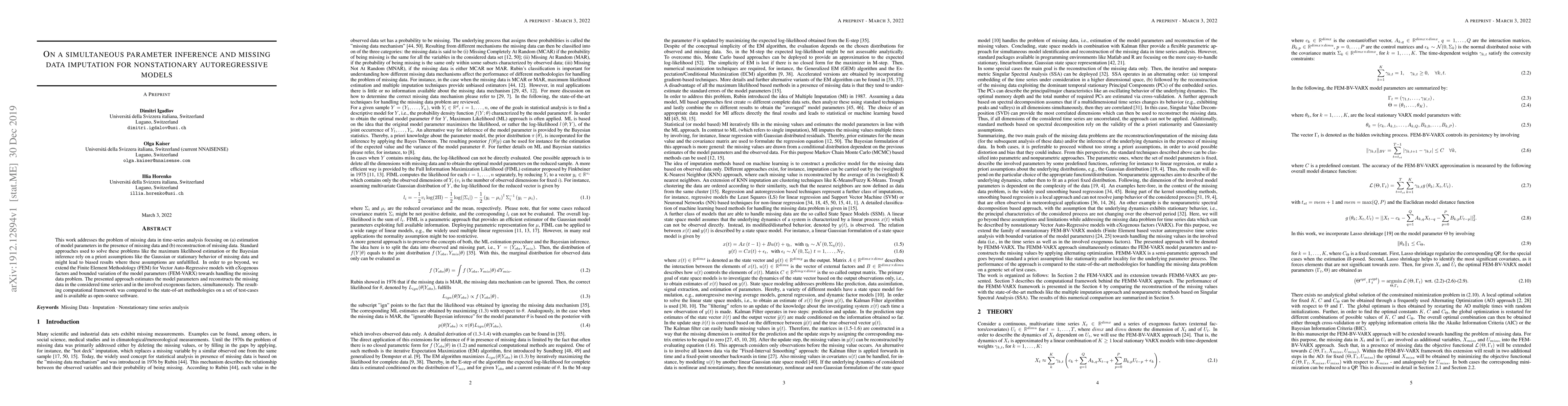 This work addresses the problem of missing data in time-series analysis focusing on (a) estimation of model parameters in the presence of missing data and (b) reconstruction of missing data. Standard approaches used to solve these problems like the maximum likelihood estimation or the Bayesian inference rely on a priori assumptions like the Gaussian or stationary behavior of missing data and might lead to biased results where these assumptions are unfulfilled. In order to go beyond, we extend the Finite Element Methodology (FEM) for Vector Auto-Regressive models with eXogenous factors and bounded variation of the model parameters (FEM-VARX) towards handling the missing data problem. The presented approach estimates the model parameters and reconstructs the missing data in the considered time series and in the involved exogenous factors, simultaneously. The resulting computational framework was compared to the state-of-art methodologies on a set of test-cases and is available as open-source software.