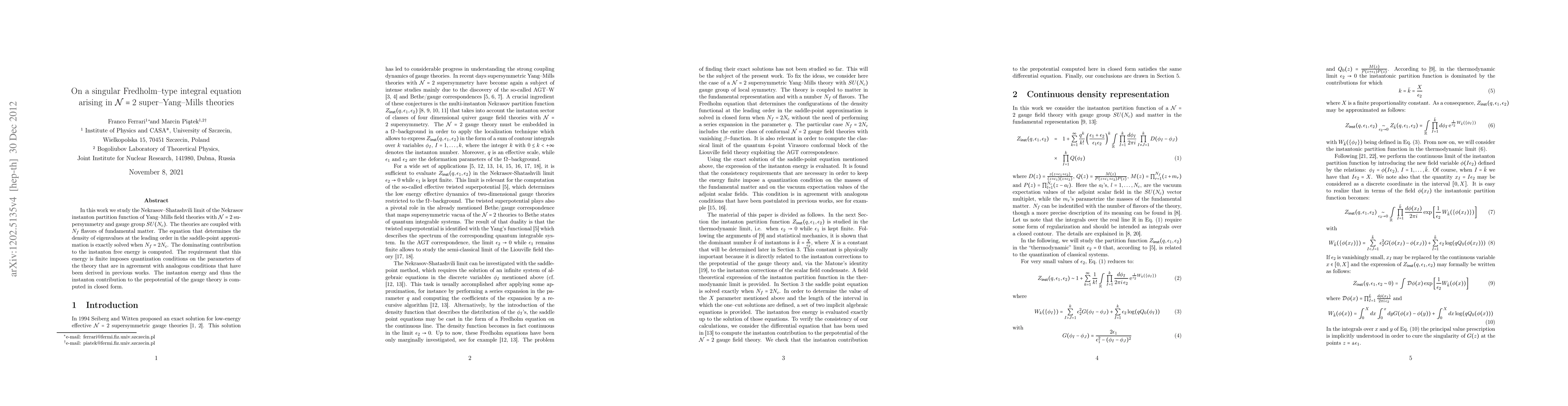 In this work we study the Nekrasov-Shatashvili limit of the Nekrasov instanton partition function of Yang-Mills field theories with N=2 supersymmetry and gauge group SU(n). The theories are coupled with fundamental matter. The equation that determines the density of eigenvalues at the leading order in the saddle-point approximation is exactly solved. The dominating contribution to the instanton free energy is computed. The requirement that this energy is finite imposes quantization conditions on the parameters of the theory that are in agreement with analogous conditions that have been derived in previous works. Using methods borrowed from the theory of matrix models, a field theoretical expression of the full instanton partition function is derived. It is checked that in the Nekrasov-Shatashvili (thermodynamic) limit the action of the field theory obtained in this way reproduces exactly the equation of motion used in the saddle-point calculations.