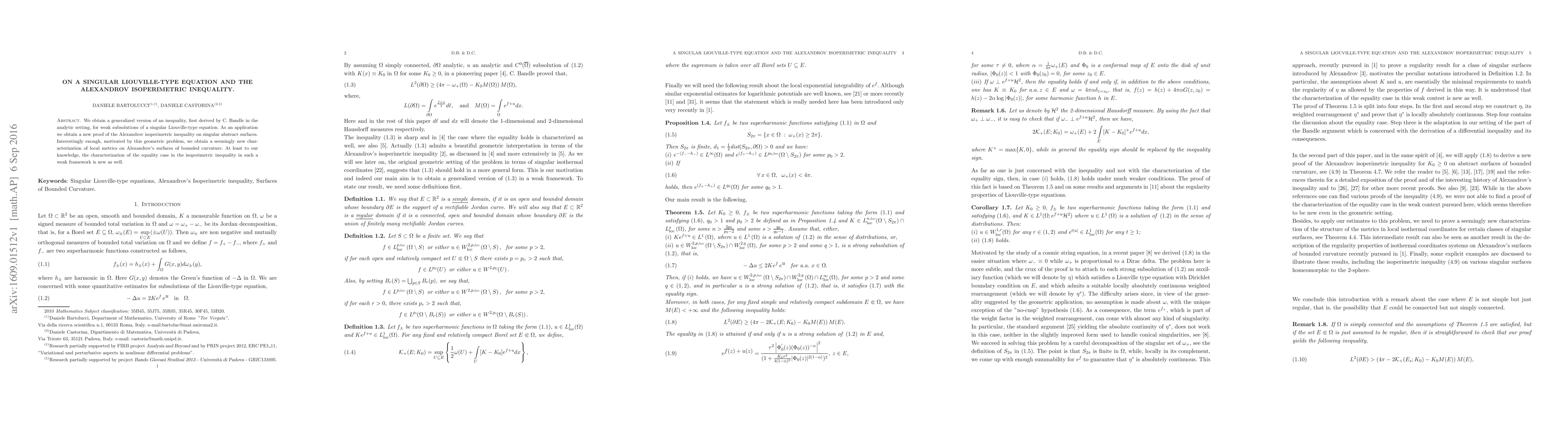 This paper generalizes a Liouville-type inequality for weak subsolutions of singular equations and provides a new proof of the Alexandrov isoperimetric inequality on abstract surfaces. It also introduces a novel characterization of local metrics on Alexandrov surfaces with bounded curvature, including a new understanding of the equality case in the isoperimetric inequality.