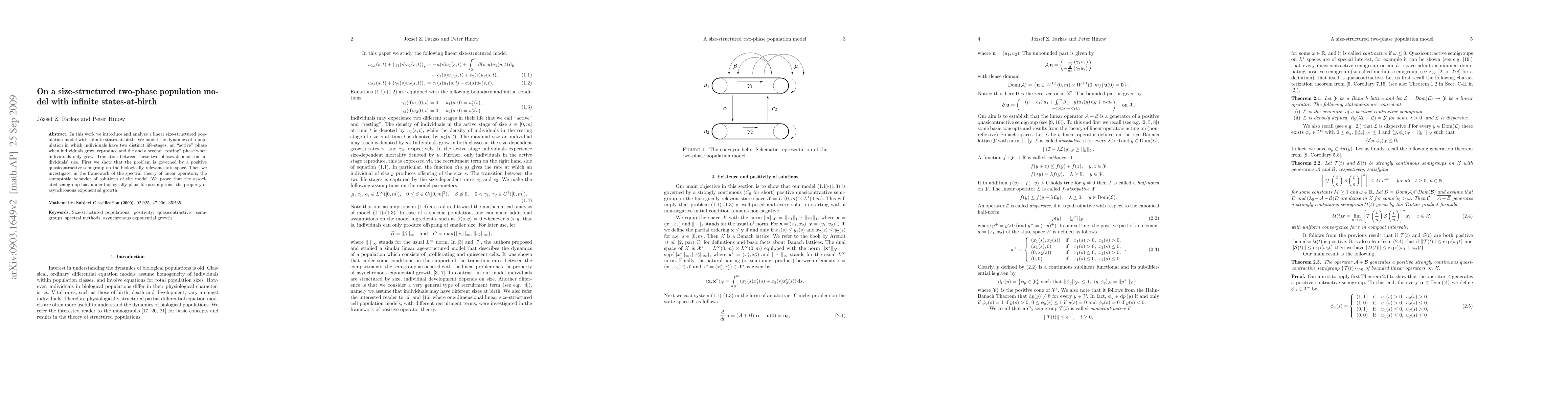In this work we introduce and analyze a linear size-structured population model with infinite states-at-birth. We model the dynamics of a population in which individuals have two distinct life-stages: an "active" phase when individuals grow, reproduce and die and a second "resting" phase when individuals only grow. Transition between these two phases depends on individuals' size. First we show that the problem is governed by a positive quasicontractive semigroup on the biologically relevant state space. Then we investigate, in the framework of the spectral theory of linear operators, the asymptotic behavior of solutions of the model. We prove that the associated semigroup has, under biologically plausible assumptions, the property of asynchronous exponential growth.