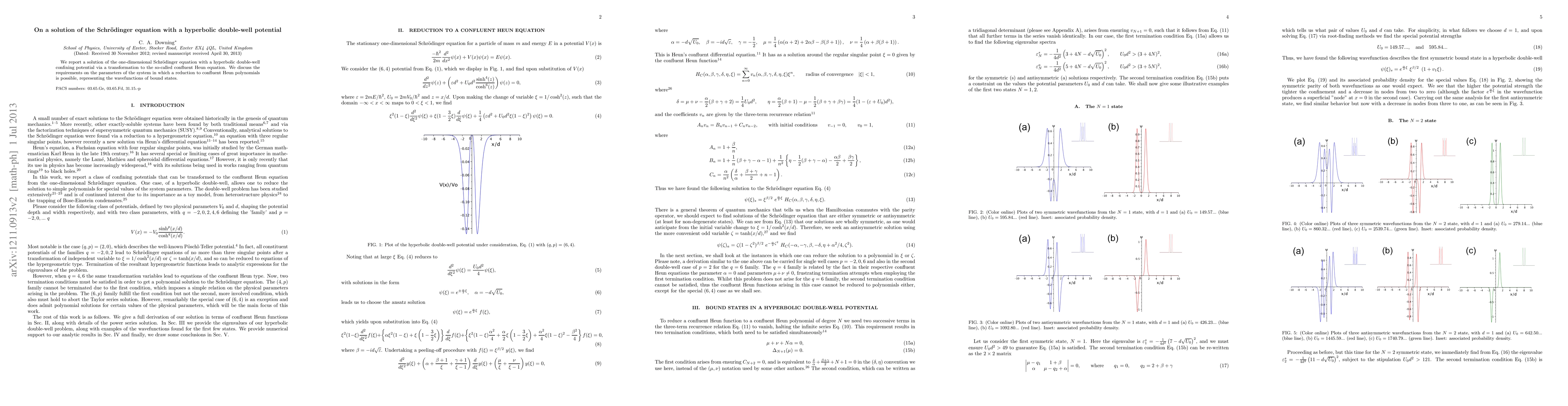 We report a solution of the one-dimensional Schrodinger equation with a hyperbolic double-well confining potential via a transformation to the so-called confluent Heun equation. We discuss the requirements on the parameters of the system in which a reduction to Heun polynomials is possible, representing the wavefunctions of bound states.