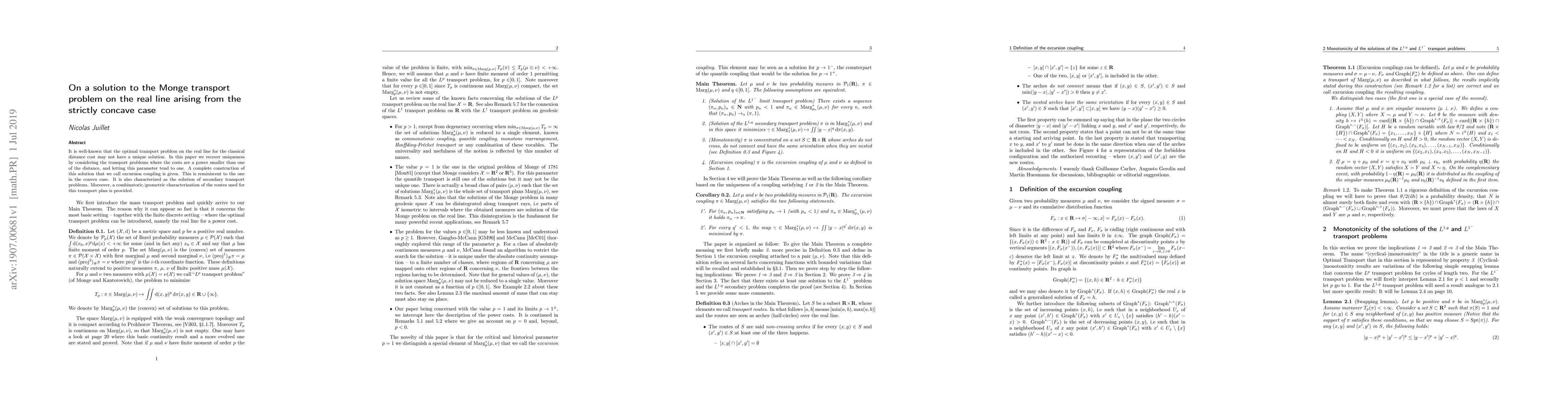 It is well-known that the optimal transport problem on the real line for the classical distance cost may not have a unique solution. In this paper we recover uniqueness by considering the transport problems where the costs are a power smaller than one of the distance, and letting this parameter tend to one. A complete construction of this solution that we call excursion coupling is given. This is reminiscent to the one in the convex case. It is also characterized as the solution of secondary transport problems. Moreover, a combinatoric/geometric characterization of the routes used for this transport plan is provided.