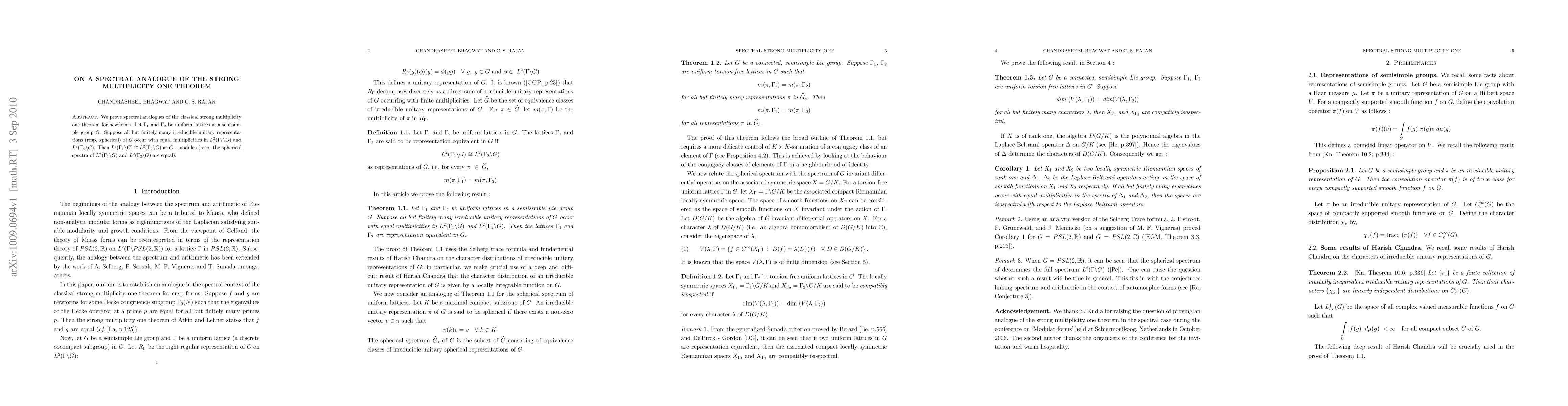 This paper proves spectral analogues of the strong multiplicity one theorem for newforms, showing that if most irreducible unitary representations of a semisimple group $G$ have equal multiplicities in the spaces $L^{2}(\Gamma_1 \backslash G)$ and $L^{2}(\Gamma_2 \backslash G)$, then these spaces are isomorphic as $G$-modules or their spherical spectra are equal.