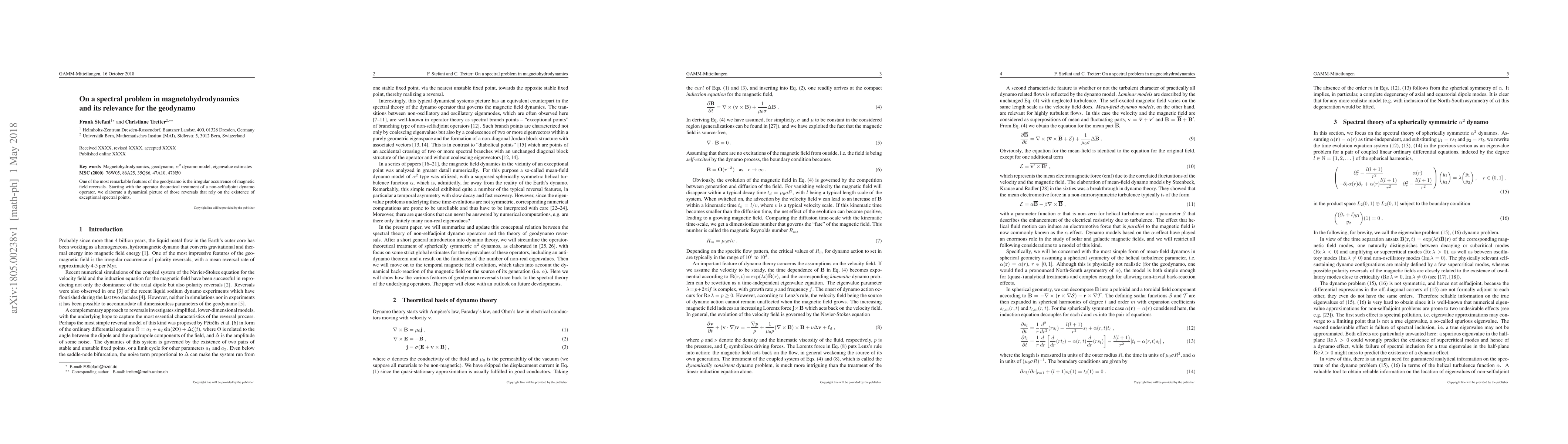 This research explores the geodynamo's magnetic field reversals via a non-selfadjoint dynamo operator, highlighting exceptional spectral points as key to understanding these irregular reversals.