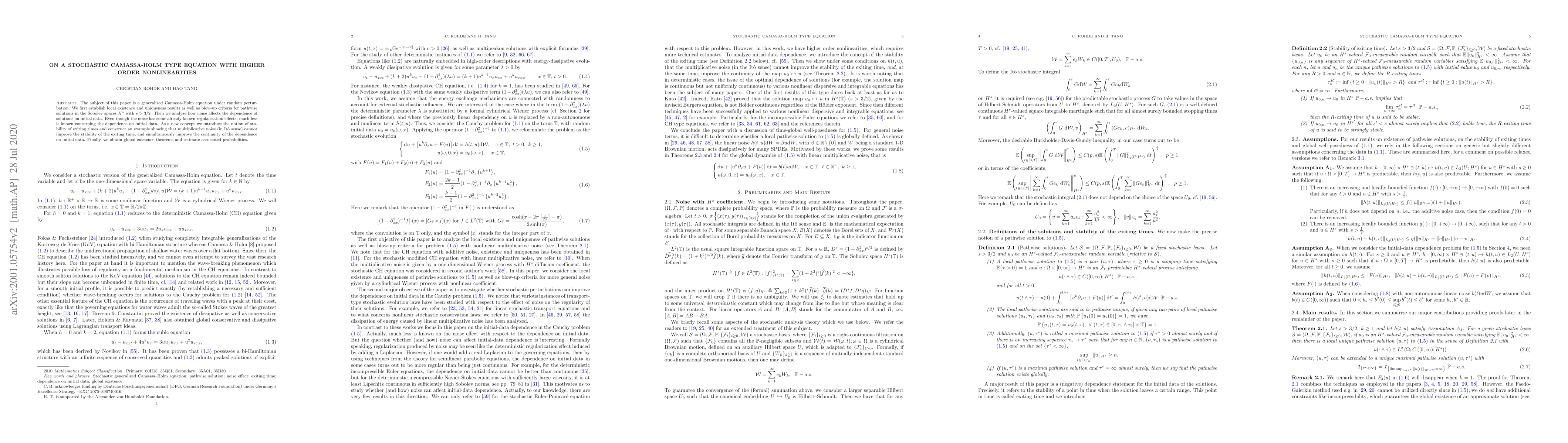 The subject of this paper is a generalized Camassa-Holm equation under random perturbation. We first establish local existence and uniqueness results as well as blow-up criteria for pathwise solutions in the Sobolev spaces $H^s$ with $s>3/2$. Then we analyze how noise affects the dependence of solutions on initial data. Even though the noise has some already known regularization effects, much less is known concerning the dependence on initial data. As a new concept we introduce the notion of stability of exiting times and construct an example showing that multiplicative noise (in It\^{o} sense) cannot improve the stability of the exiting time, and simultaneously improve the continuity of the dependence on initial data. Finally, we obtain global existence theorems and estimate associated probabilities.