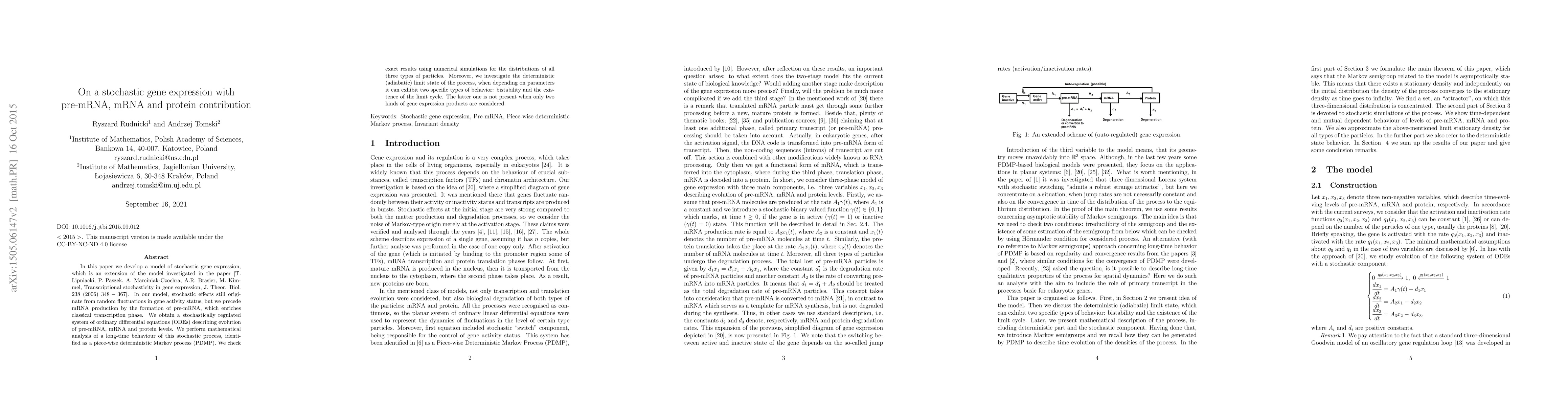 In this paper we develop a model of stochastic gene expression, which is an extension of the model investigated in the paper [T. Lipniacki, P. Paszek, A. Marciniak-Czochra, A.R. Brasier, M. Kimmel, Transcriptional stochasticity in gene expression, J. Theor. Biol. 238 (2006) 348-367]. In our model, stochastic effects still originate from random uctuations in gene activity status, but we precede mRNA production by the formation of pre-mRNA, which enriches classical transcription phase. We obtain a stochastically regulated system of ordinary differential equations (ODEs) describing evolution of pre-mRNA, mRNA and protein levels. We perform mathematical analysis of a long-time behaviour of this stochastic process, identified as a piece-wise deterministic Markov process (PDMP). We check exact results using numerical simulations for the distributions of all three types of particles. Moreover, we investigate the deterministic (adiabatic) limit state of the process, when depending on parameters it can exhibit two specific types of behavior: bistability and the existence of the limit cycle. The latter one is not present when only two kinds of gene expression products are considered.