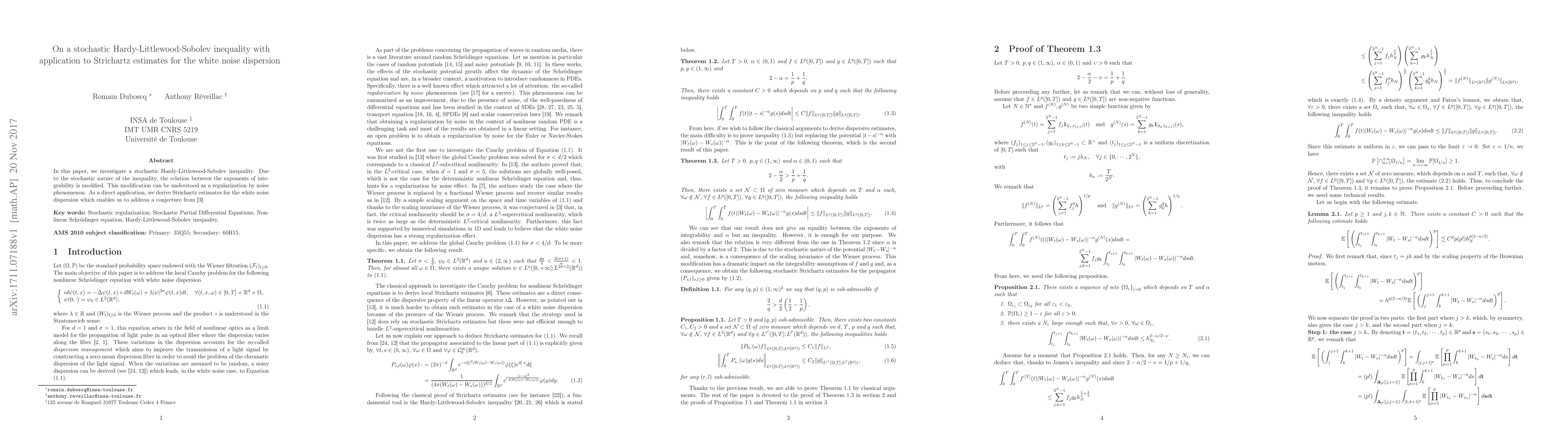 This paper explores a stochastic Hardy-Littlewood-Sobolev inequality, revealing a modified integrability relation due to noise, termed a regularization by noise phenomenon. The study applies this to derive Strichartz estimates for white noise dispersion, thereby addressing a conjecture from [3].