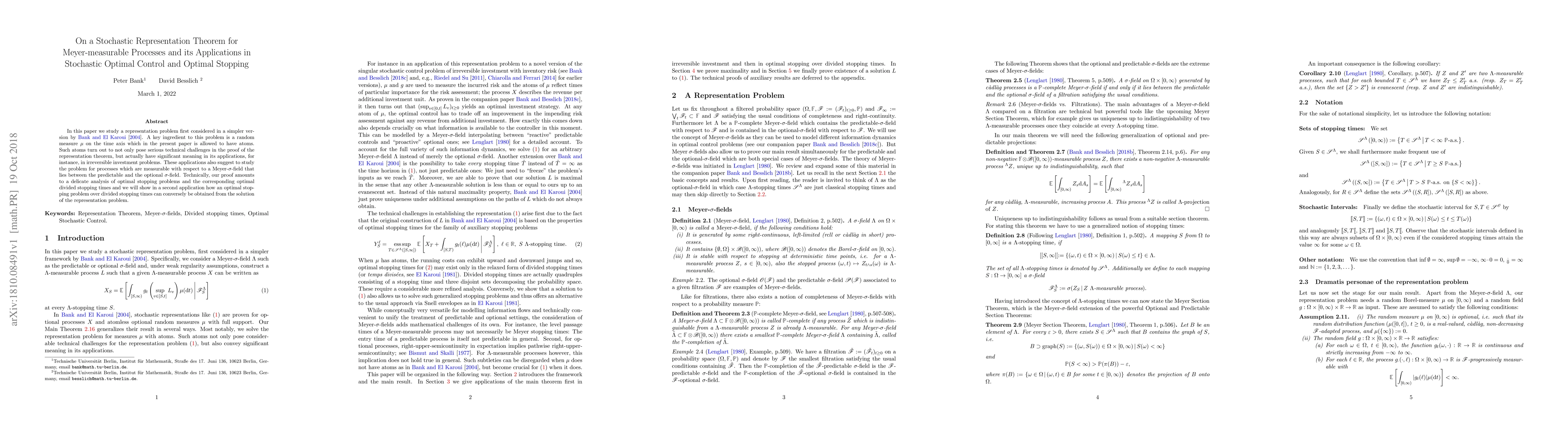 This paper presents a stochastic representation theorem for Meyer-measurable processes, addressing technical challenges posed by random measures with atoms. The theorem's application in stochastic optimal control and optimal stopping highlights its significance in irreversible investment problems and demonstrates a reciprocal relationship between representation problems and optimal stopping.