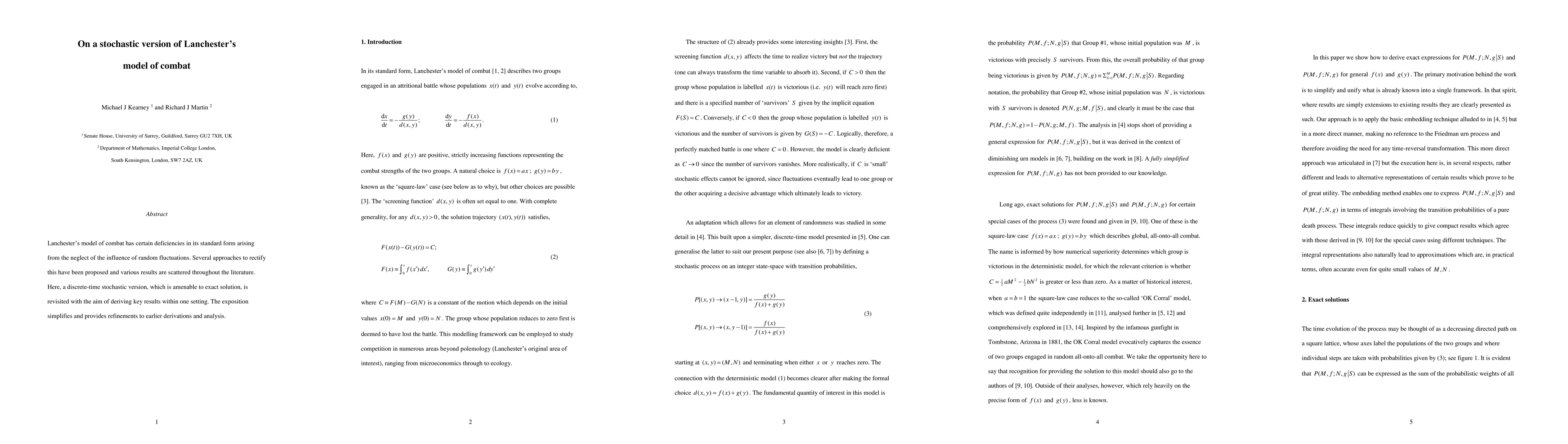 This paper revisits a stochastic version of Lanchester's combat model to address its deficiencies due to random fluctuations, offering a discrete-time framework that allows for exact solutions and simplifying previous derivations. The goal is to derive key results within a refined analytical setting.