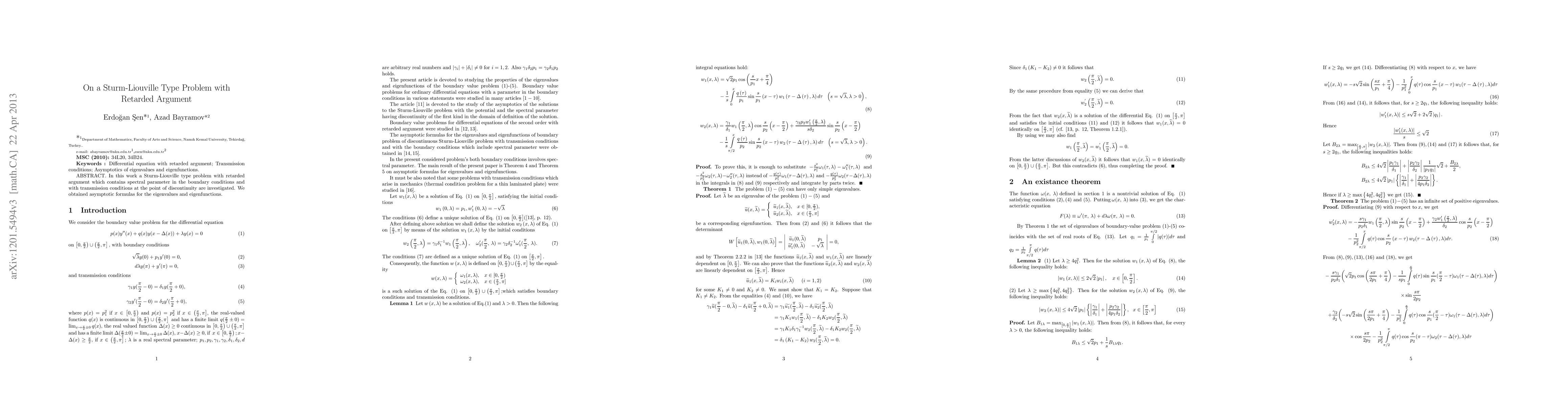 In this work a Sturm-Liouville type problem with retarded argument which contains spectral parameter in the boundary conditions and with transmission conditions at the point of discontinuity are investigated. We obtained asymptotic formulas for the eigenvalues and eigenfunctions.