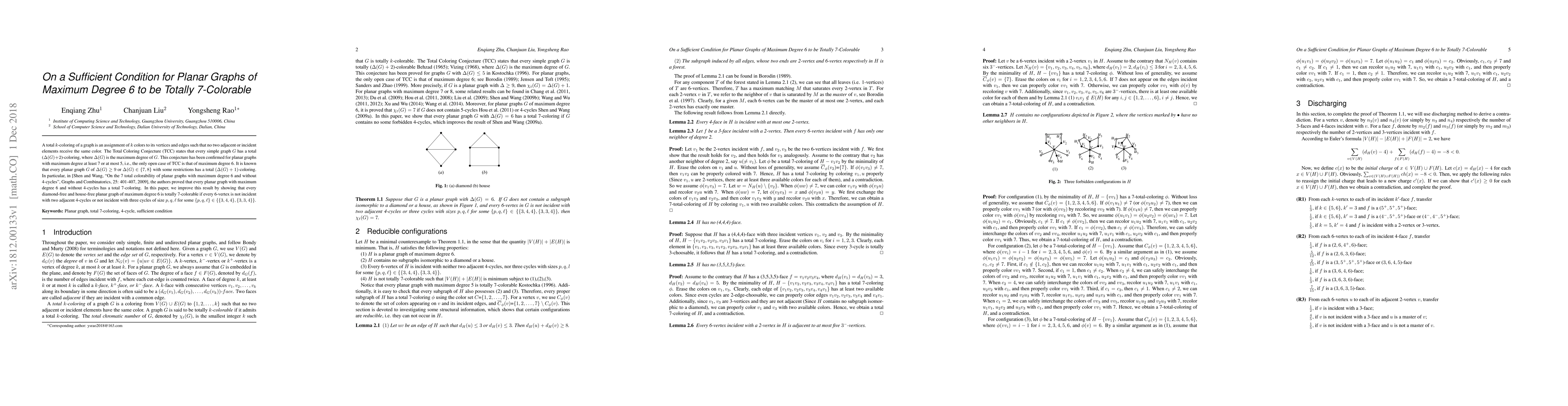 A planar graph with maximum degree 6 can be totally 7-colorable if it does not contain specific types of cycles or has certain restrictions on its vertices.