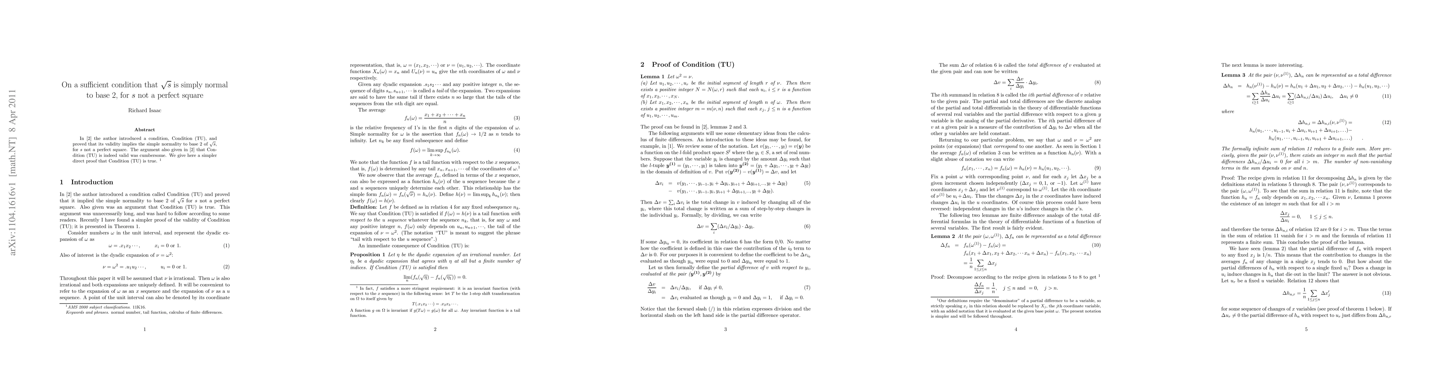 A simple proof is given of a sufficient condition that the square root of s is simply normal to base 2, for s not a perfect square. This relates to previous work of the author.