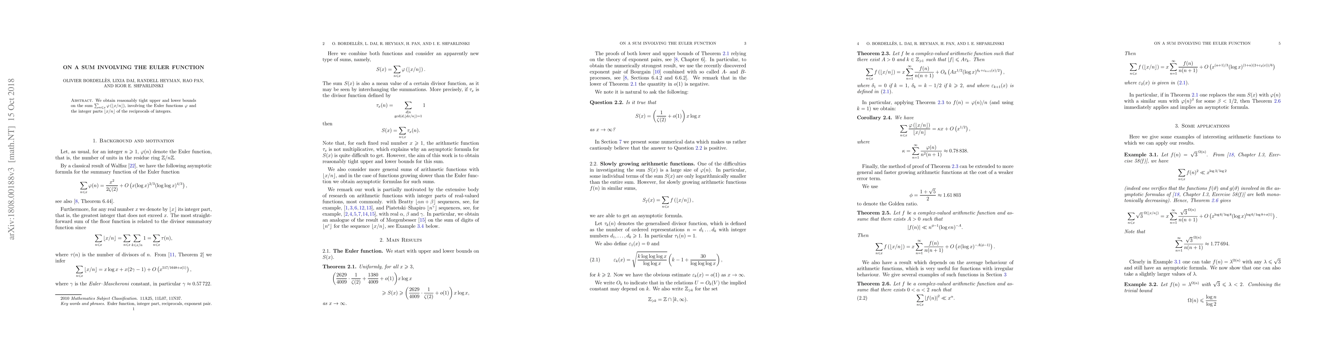 This paper provides tight upper and lower bounds for a sum involving the Euler function and its relationship with integer parts of reciprocals.
