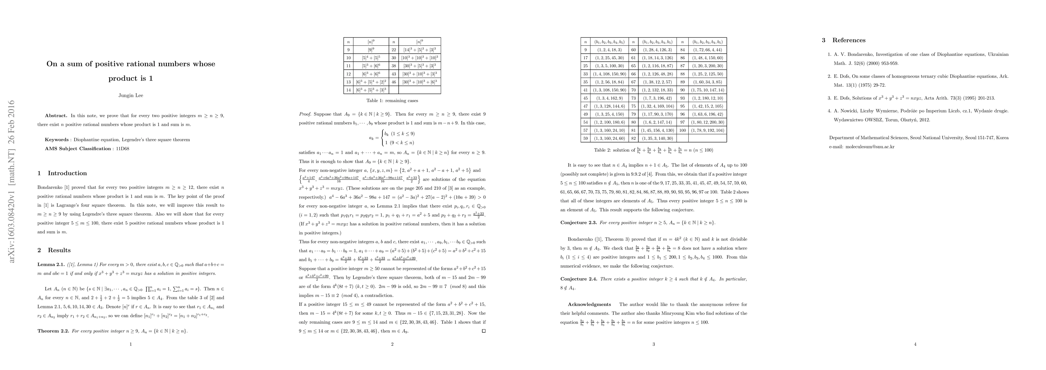 Summary: This paper proves the existence of $n$ positive rational numbers whose product equals 1 and sum equals $m$ for any integers $m \geq n \geq 9$. The result highlights a specific case in the study of rational number representations.