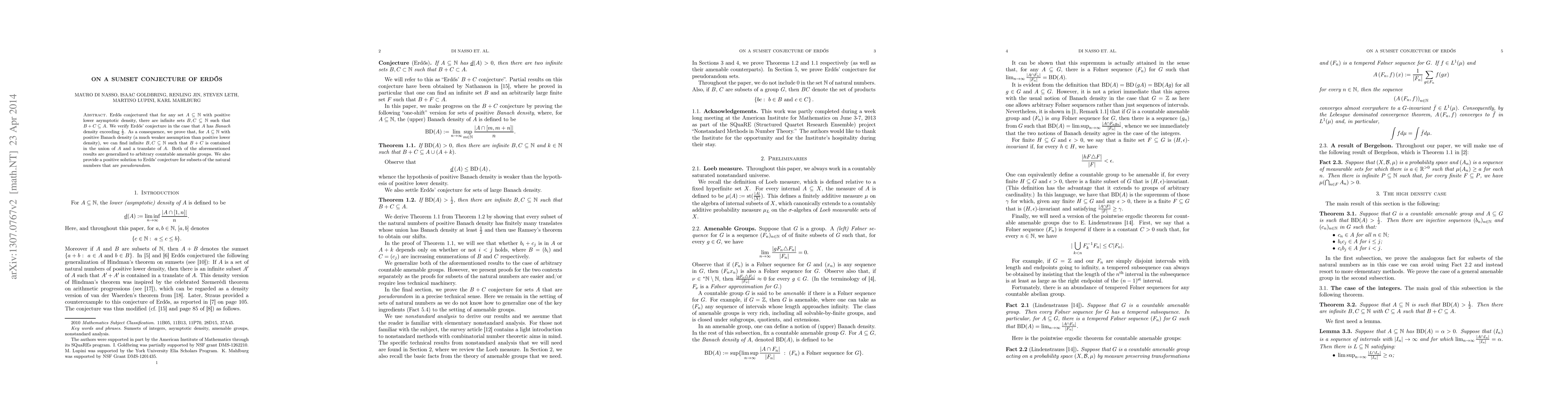 Erd\H{o}s conjectured that for any set $A\subseteq \mathbb{N}$ with positive lower asymptotic density, there are infinite sets $B,C\subseteq \mathbb{N}$ such that $B+C\subseteq A$. We verify Erd\H{o}s' conjecture in the case that $A$ has Banach density exceeding $\frac{1}{2}$. As a consequence, we prove that, for $A\subseteq \mathbb{N}$ with positive Banach density (a much weaker assumption than positive lower density), we can find infinite $B,C\subseteq \mathbb{N}$ such that $B+C$ is contained in the union of $A$ and a translate of $A$. Both of the aforementioned results are generalized to arbitrary countable amenable groups. We also provide a positive solution to Erd\H{o}s' conjecture for subsets of the natural numbers that are pseudorandom.
