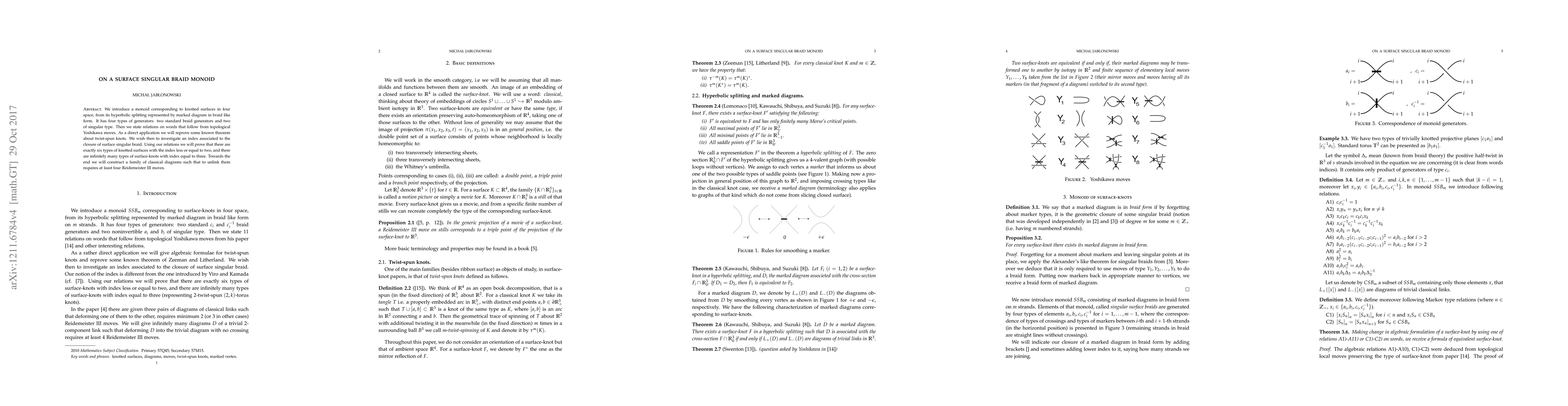 The paper introduces a monoid corresponding to knotted surfaces in four-dimensional space, derived from hyperbolic splitting represented by marked diagrams in braid-like form. It defines four types of generators and states relations on words based on topological Yoshikawa moves.