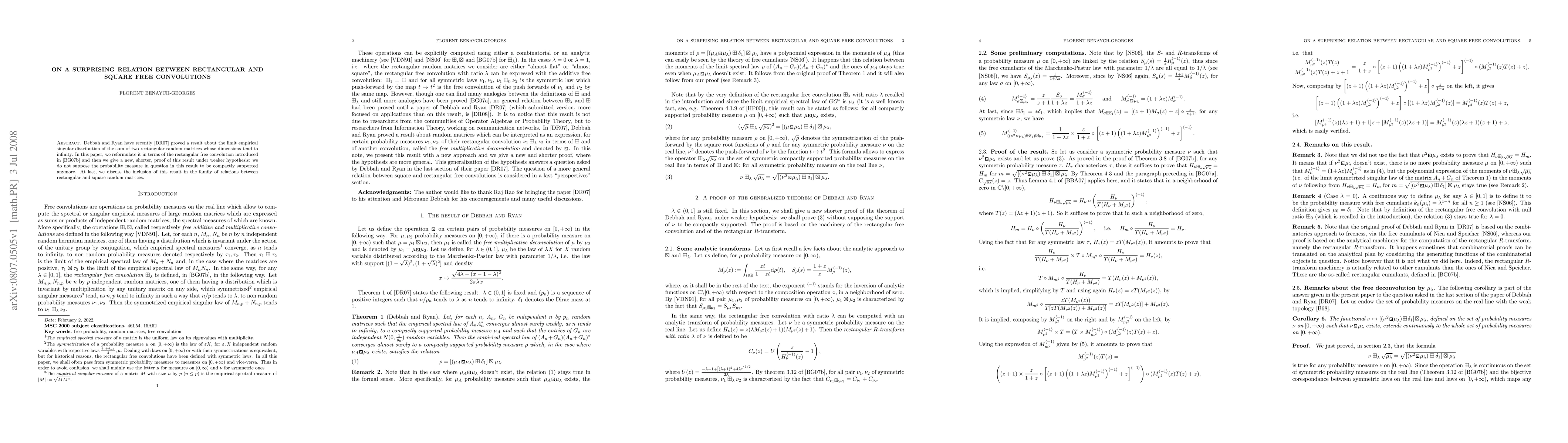 Debbah and Ryan have recently proved a result about the limit empirical singular distribution of the sum of two rectangular random matrices whose dimensions tend to infinity. In this paper, we reformulate it in terms of the rectangular free convolution introduced in a previous paper and then we give a new, shorter, proof of this result under weaker hypothesis: we do not suppose the \pro measure in question in this result to be compactly supported anymore. At last, we discuss the inclusion of this result in the family of relations between rectangular and square random matrices.