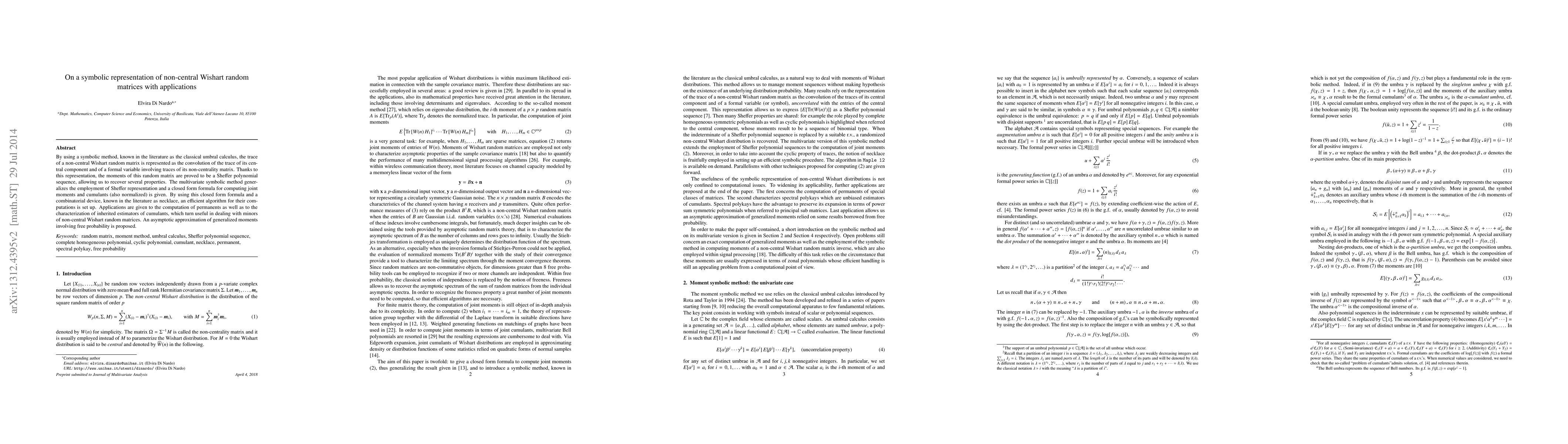 This paper introduces a symbolic representation for non-central Wishart random matrices using classical umbral calculus, proving their moments are Sheffer polynomial sequences. It provides a closed-form formula for joint moments and cumulants, an efficient computation algorithm using necklace combinatorics, and applications in permanent computation and inherited estimator characterization of cumulants. The paper also proposes an asymptotic approximation involving free probability.