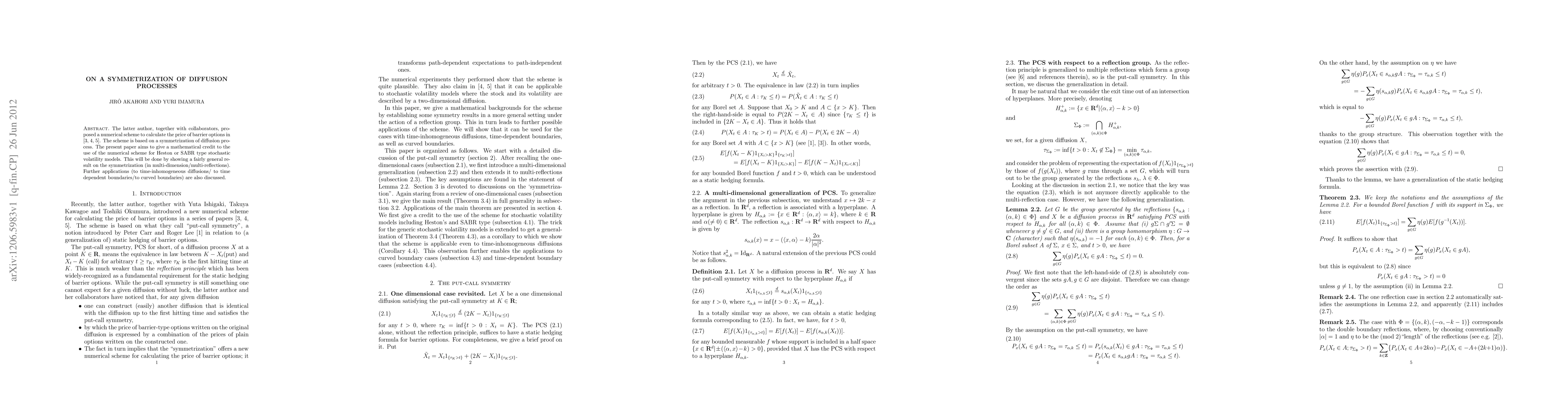 The latter author, together with collaborators, proposed a numerical scheme to calculate the price of barrier options. The scheme is based on a symmetrization of diffusion process. The present paper aims to give a mathematical credit to the use of the numerical scheme for Heston or SABR type stochastic volatility models. This will be done by showing a fairly general result on the symmetrization (in multi-dimension/multi-reflections). Further applications (to time-inhomogeneous diffusions/ to time dependent boundaries/to curved boundaries) are also discussed.