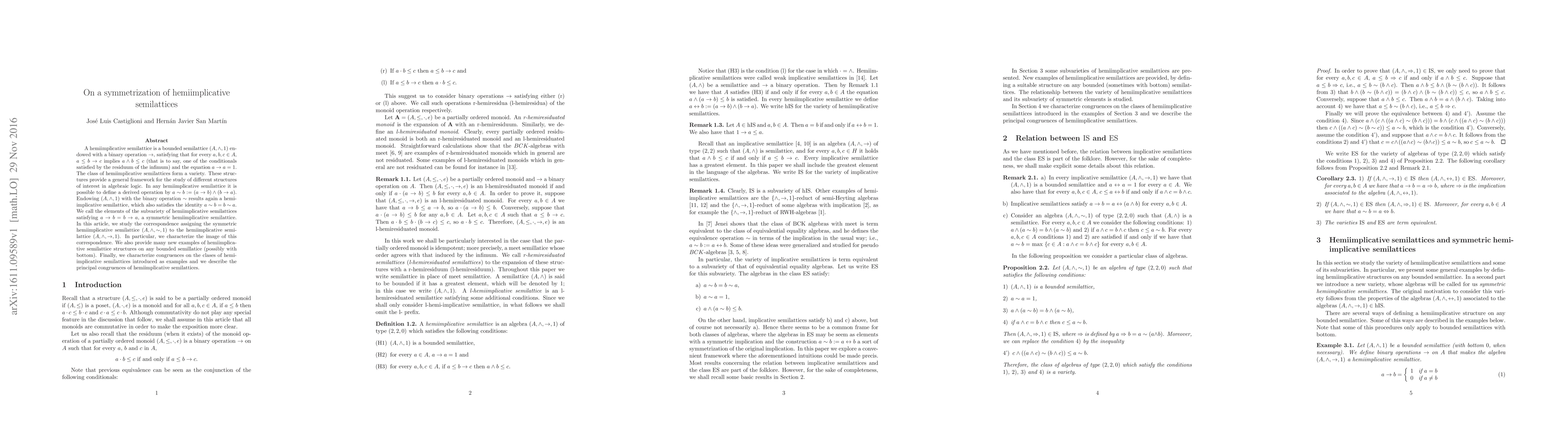 A hemiimplicative semilattice is a bounded semilattice $(A, \wedge, 1)$ endowed with a binary operation $\to$, satisfying that for every $a, b, c \in A$, $a \leq b \to c$ implies $a \wedge b \leq c$ (that is to say, one of the conditionals satisfied by the residuum of the infimum) and the equation $a \to a = 1$. The class of hemiimplicative semilattices form a variety. These structures provide a general framework for the study of different structures of interest in algebraic logic. In any hemiimplicative semilattice it is possible to define a derived operation by $a \sim b := (a \to b) \wedge (b \to a)$. Endowing $(A, \wedge, 1)$ with the binary operation $\sim$ results again a hemiimplicative semilattice, which also satisfies the identity $a \sim b = b \sim a$. We call the elements of the subvariety of hemiimplicative semilattices satisfying $a \to b = b \to a$, a symmetric hemiimplicative semilattice. In this article, we study the correspondence assigning the symmetric hemiimplicative semilattice $(A, \wedge, \sim , 1)$ to the hemiimplicative semilattice $(A, \wedge, \to, 1)$. In particular, we characterize the image of this correspondence. We also provide many new examples of hemiimplicative semilattice structures on any bounded semillatice (possibly with bottom). Finally, we characterize congruences on the clases of hemiimplicative semilattices introduced as examples and we describe the principal congruences of hemiimplicative semilattices.