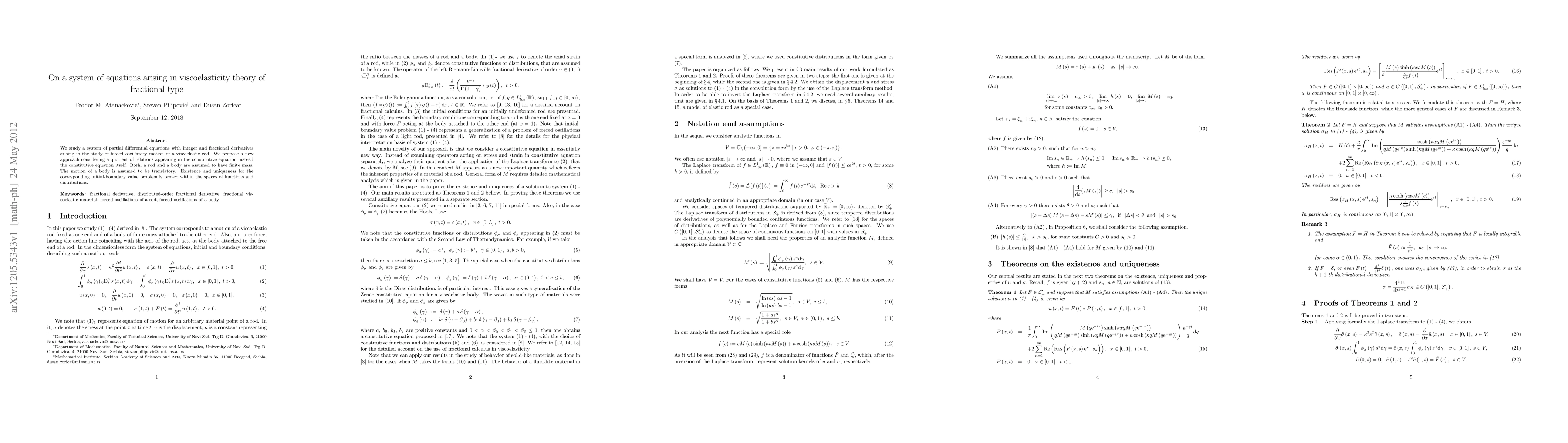 We study a system of partial differential equations with integer and fractional derivatives arising in the study of forced oscillatory motion of a viscoelastic rod. We propose a new approach considering a quotient of relations appearing in the constitutive equation instead the constitutive equation itself. Both, a rod and a body are assumed to have finite mass. The motion of a body is assumed to be translatory. Existence and uniqueness for the corresponding initial-boundary value problem is proved within the spaces of functions and distributions.