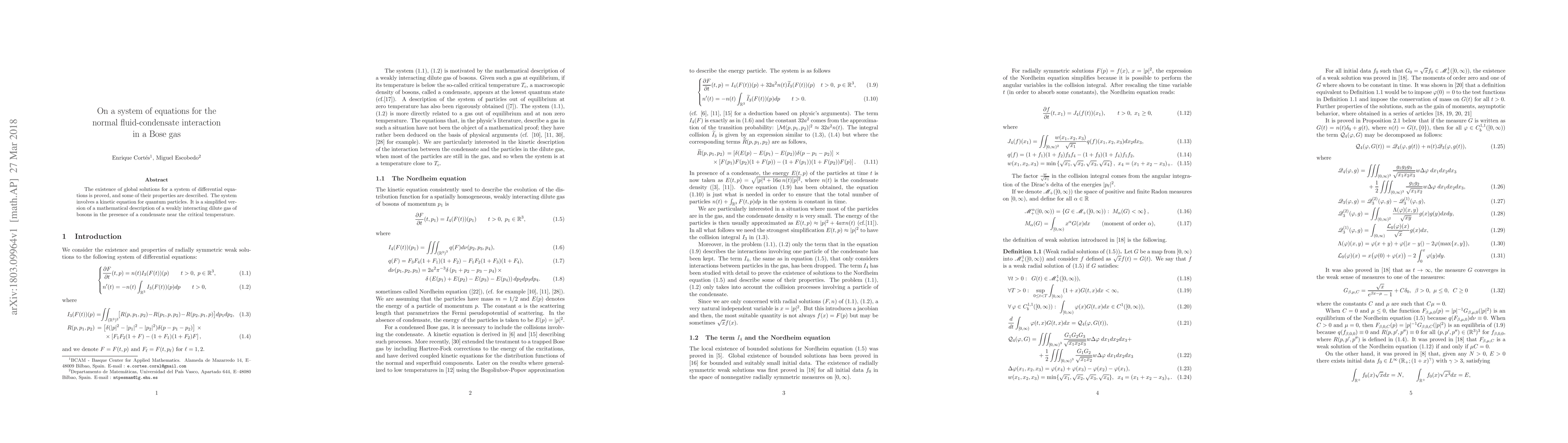 The existence of global solutions for a system of differential equations is proved, and some of their properties are described. The system involves a kinetic equation for quantum particles. It is a simplified version of a mathematical description of a weakly interacting dilute gas of bosons in the presence of a condensate near the critical temperature.