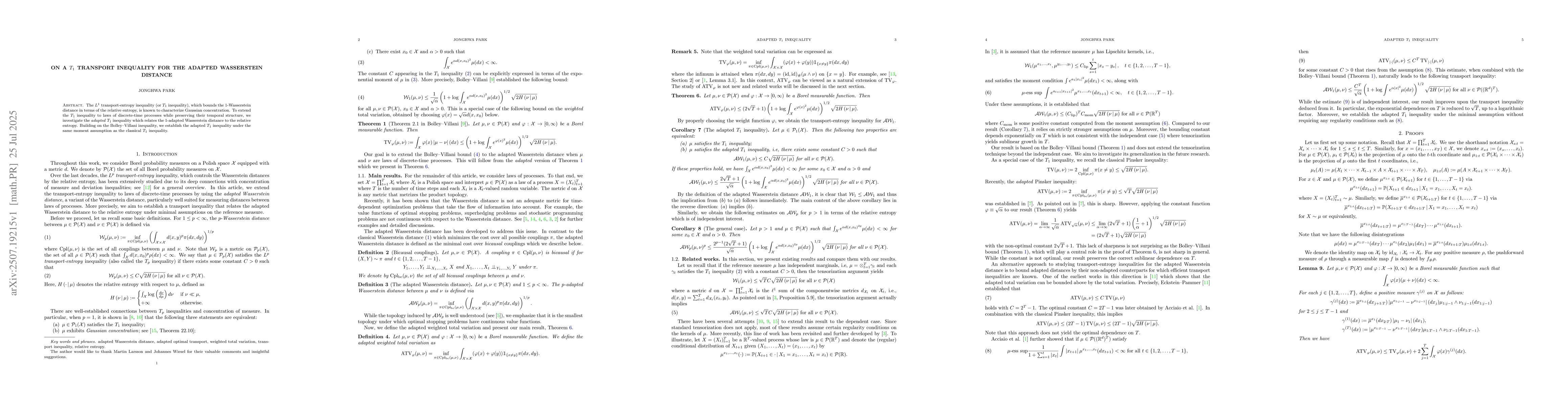 The $L^1$ transport-entropy inequality (or $T_1$ inequality), which bounds the $1$-Wasserstein distance in terms of the relative entropy, is known to characterize Gaussian concentration. To extend the $T_1$ inequality to laws of discrete-time processes while preserving their temporal structure, we investigate the adapted $T_1$ inequality which relates the $1$-adapted Wasserstein distance to the relative entropy. Building on the Bolley--Villani inequality, we establish the adapted $T_1$ inequality under the same moment assumption as the classical $T_1$ inequality.