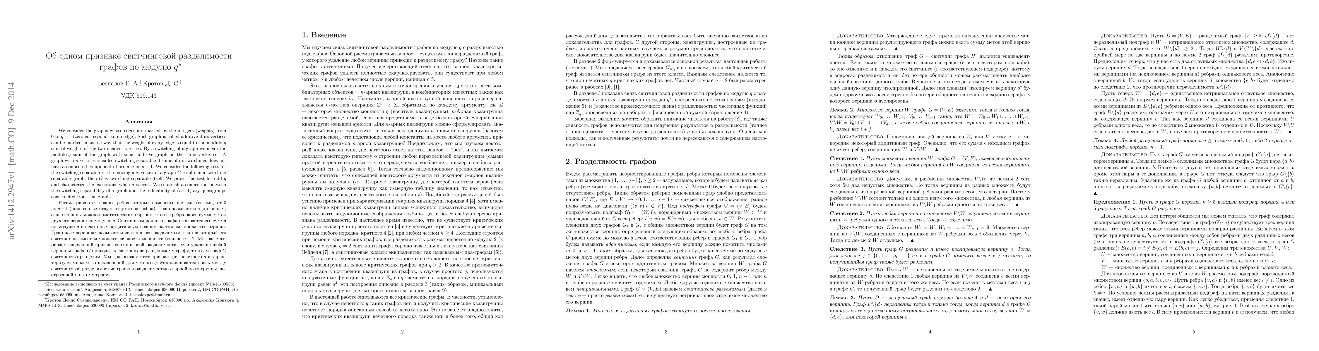 We consider the graphs whose edges are marked by the integers (weights) from $0$ to $q-1$ (zero corresponds to no-edge). Such graph is called additive if its vertices can be marked in such a way that the weight of every edge is equal to the modulo-$q$ sum of weights of the two incident vertices. By a switching of a graph we mean the modulo-$q$ sum of the graph with some additive graph on the same vertex set. A graph with $n$ vertices is called switching separable if some of its switchings does not have a connected component of order $n$ or $n-1$. We consider the following test for the switching separability: if removing any vertex of a graph $G$ results in a switching separable graph, then $G$ is switching separable itself. We prove this test for odd $q$ and characterize the exceptions when $q$ is even. We establish a connection between the switching separability of a graph and the reducibility of $(n-1)$-ary quasigroups constructed from this graph.