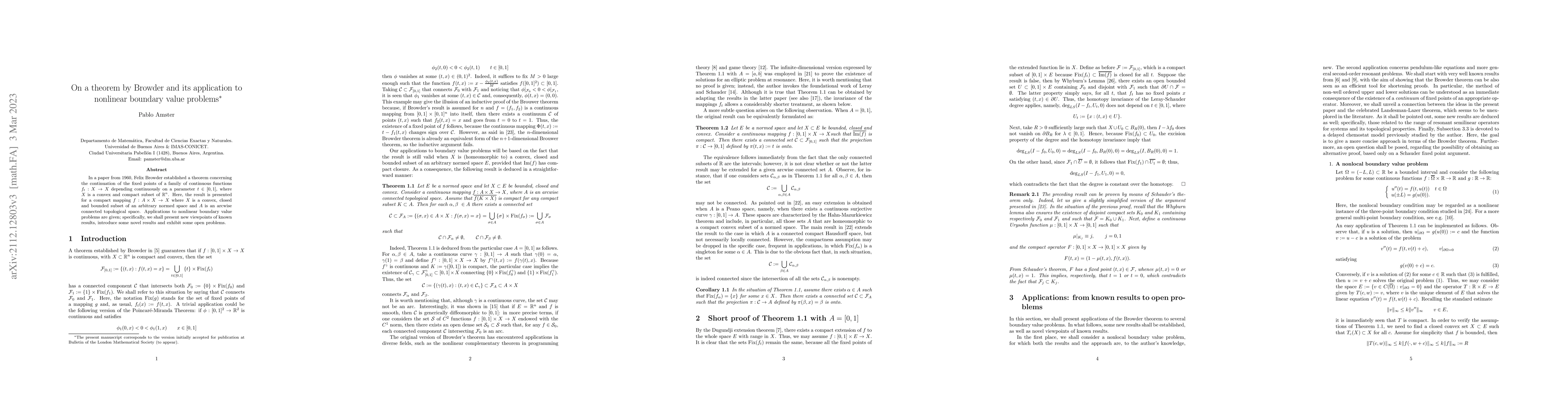 Summary: This paper revisits Felix Browder's 1960 theorem on fixed points of continuous functions, extending it to a broader context involving compact mappings in normed spaces. It applies these results to new insights and novel findings in nonlinear boundary value problems, while also highlighting open questions in the field.