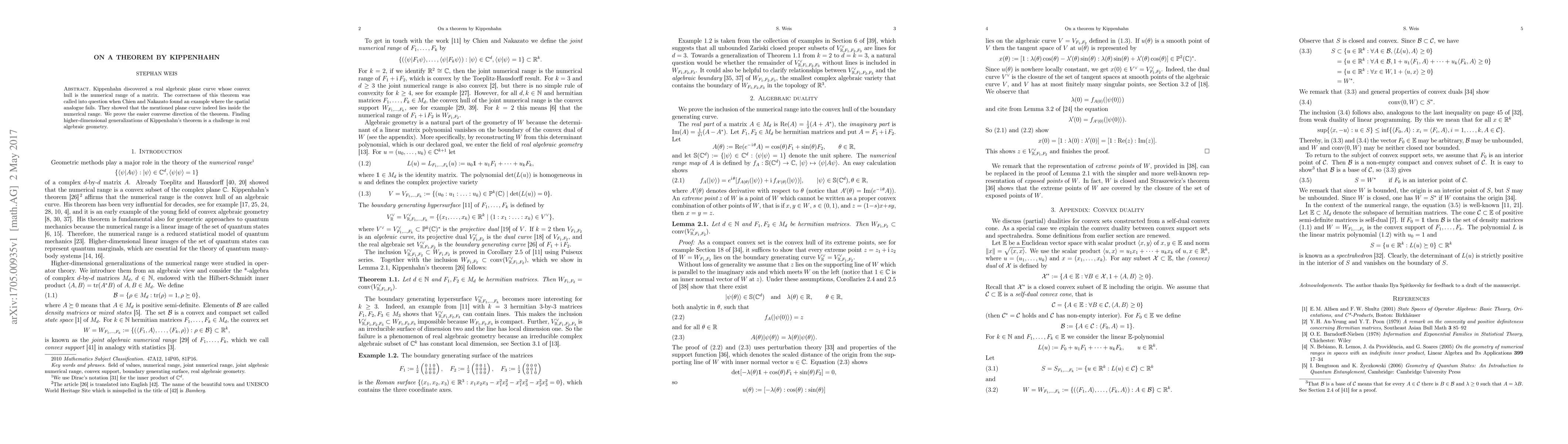 The paper proves the converse direction of Kippenhahn's theorem concerning a real algebraic plane curve whose convex hull matches the numerical range of a matrix, despite earlier counterexamples. Higher-dimensional generalizations of this theorem remain an open challenge in real algebraic geometry.