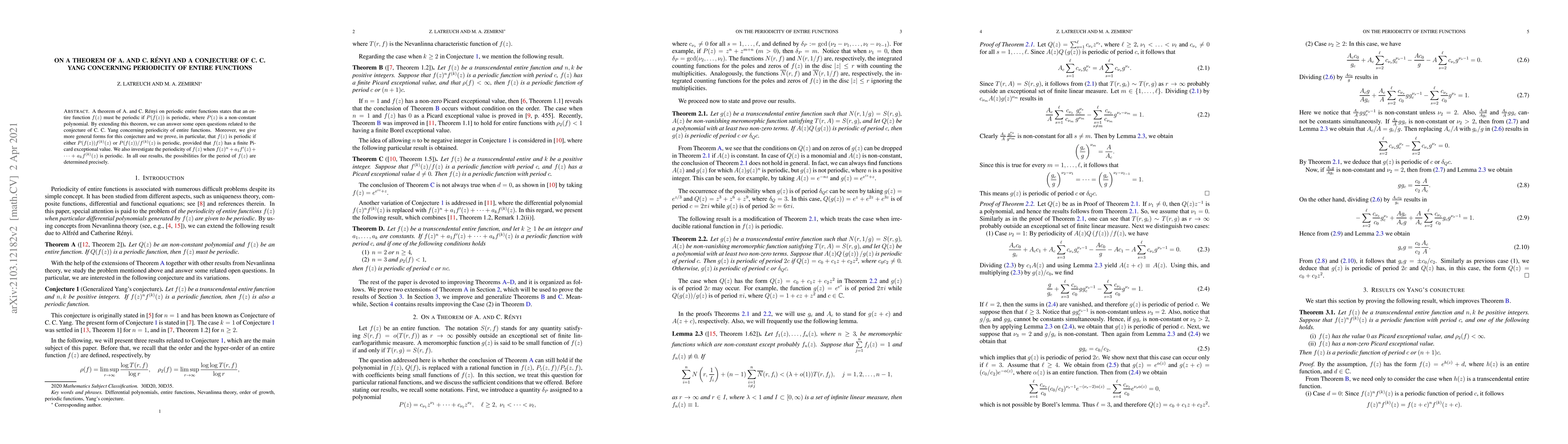 A theorem of A. and C. R\'enyi on periodic entire functions states that an entire function $f(z) $ must be periodic if $ P(f(z)) $ is periodic, where $ P(z) $ is a non-constant polynomial. By extending this theorem, we can answer some open questions related to the conjecture of C. C. Yang concerning periodicity of entire functions. Moreover, we give more general forms for this conjecture and we prove, in particular, that $ f(z) $ is periodic if either $ P(f(z)) f^{(k)}(z) $ or $ P(f(z))/f^{(k)}(z) $ is periodic, provided that $ f(z) $ has a finite Picard exceptional value. We also investigate the periodicity of $ f(z) $ when $ f(z)^{n}+a_{1} f^{\prime}(z)+\cdots+a_{k} f^{(k)}(z) $ is periodic. In all our results, the possibilities for the period of $ f(z) $ are determined precisely.