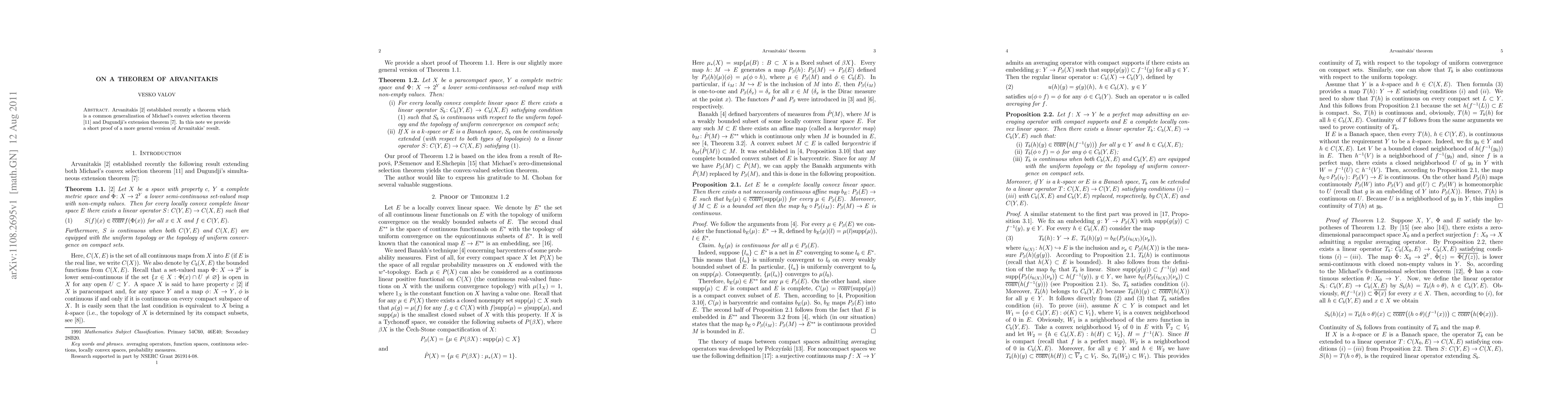 Arvanitakis established recently a theorem which is a common generalization of Michael's convex selection theorem and Dugundji's extension theorem. In this note we provide a short proof of a more general version of Arvanitakis' result.