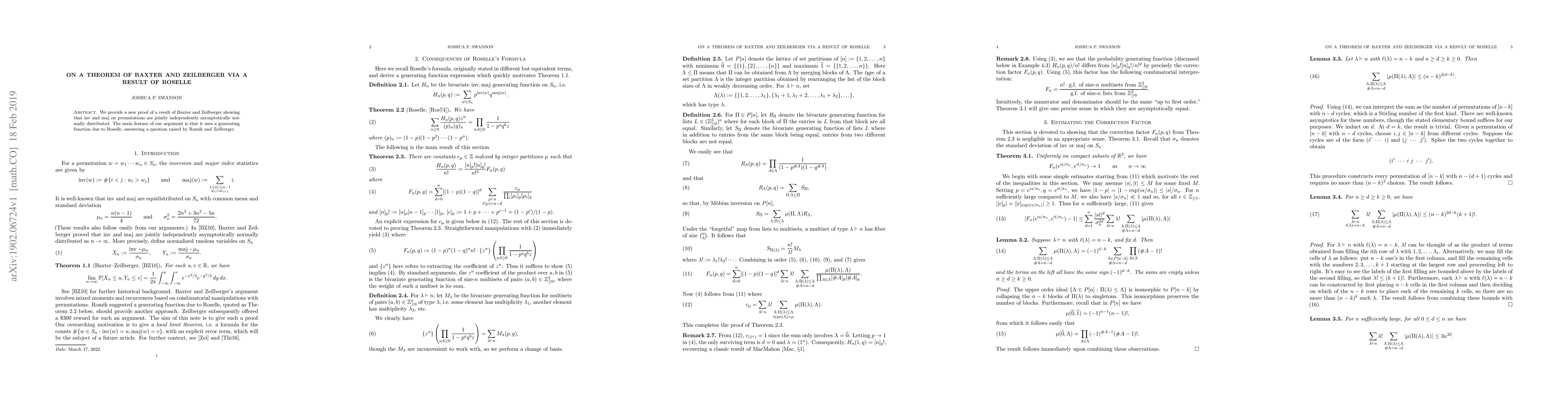 Researchers provide a new proof of a theorem by Baxter and Zeilberger showing that certain permutation properties are asymptotically normally distributed using a generating function due to Roselle.