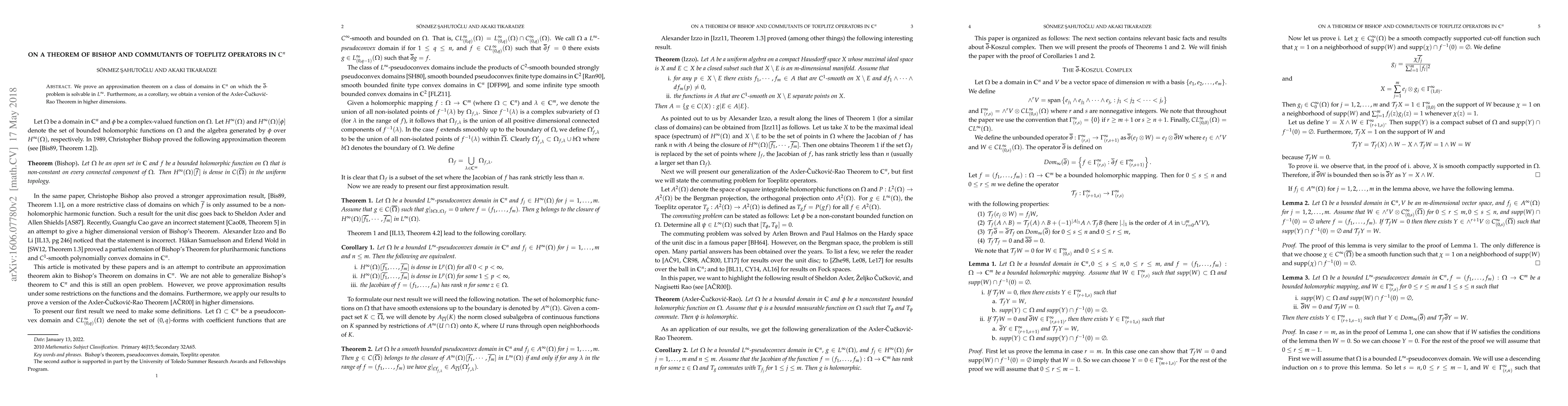 We prove an approximation theorem on a class of domains in $\mathbb{C}^n$ on which the $\overline{\partial}$-problem is solvable in $L^{\infty}$. Furthermore, as a corollary, we obtain a version of the Axler-\v{C}u\v{c}kovi\'c-Rao Theorem in higher dimensions.