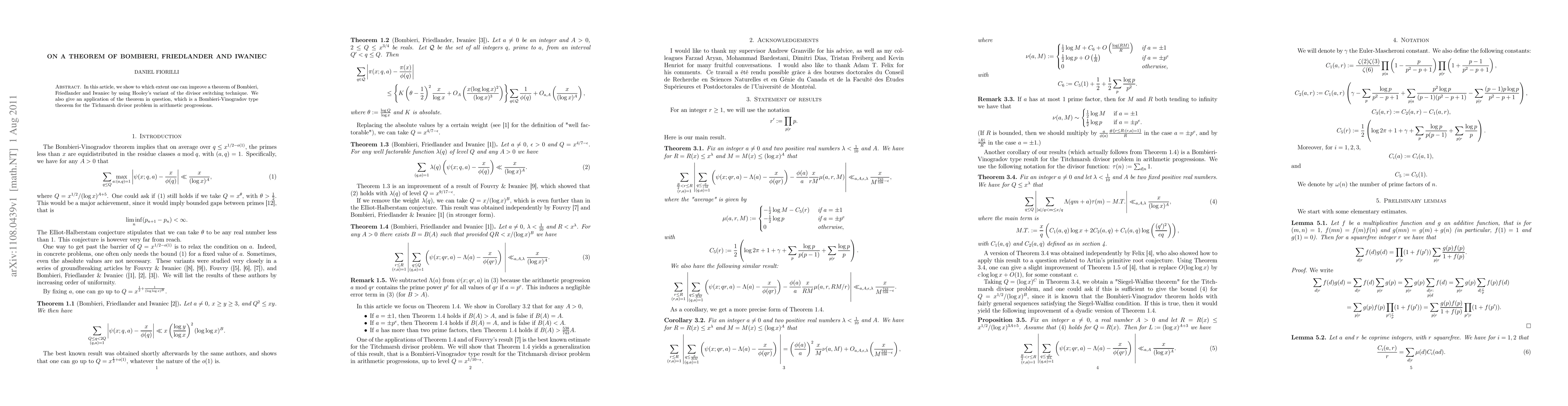 This paper improves the theorem of Bombieri, Friedlander, and Iwaniec using Hooley's divisor switching technique and applies it to establish a Bombieri-Vinogradov type result for the Titchmarsh divisor problem in arithmetic progressions.