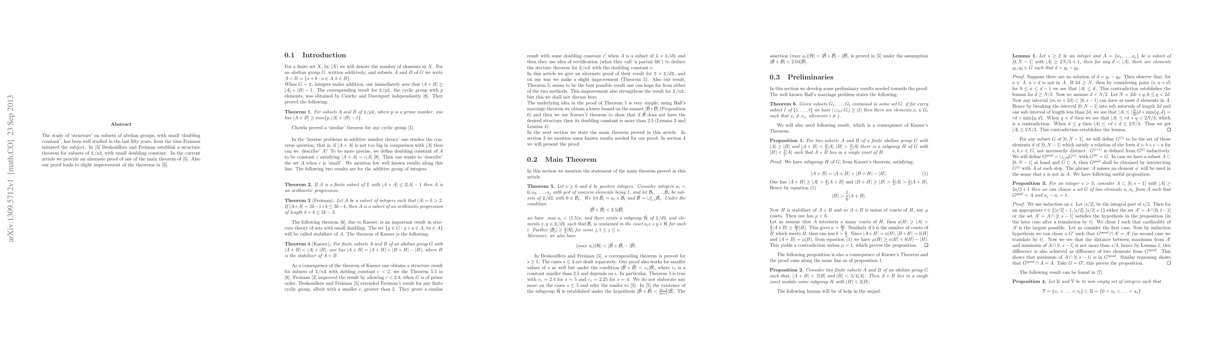 This paper presents an alternate proof for a key theorem by Deshouillers and Freiman regarding the structure of subsets of abelian groups with small doubling constant, and it also leads to a minor improvement of the original results.