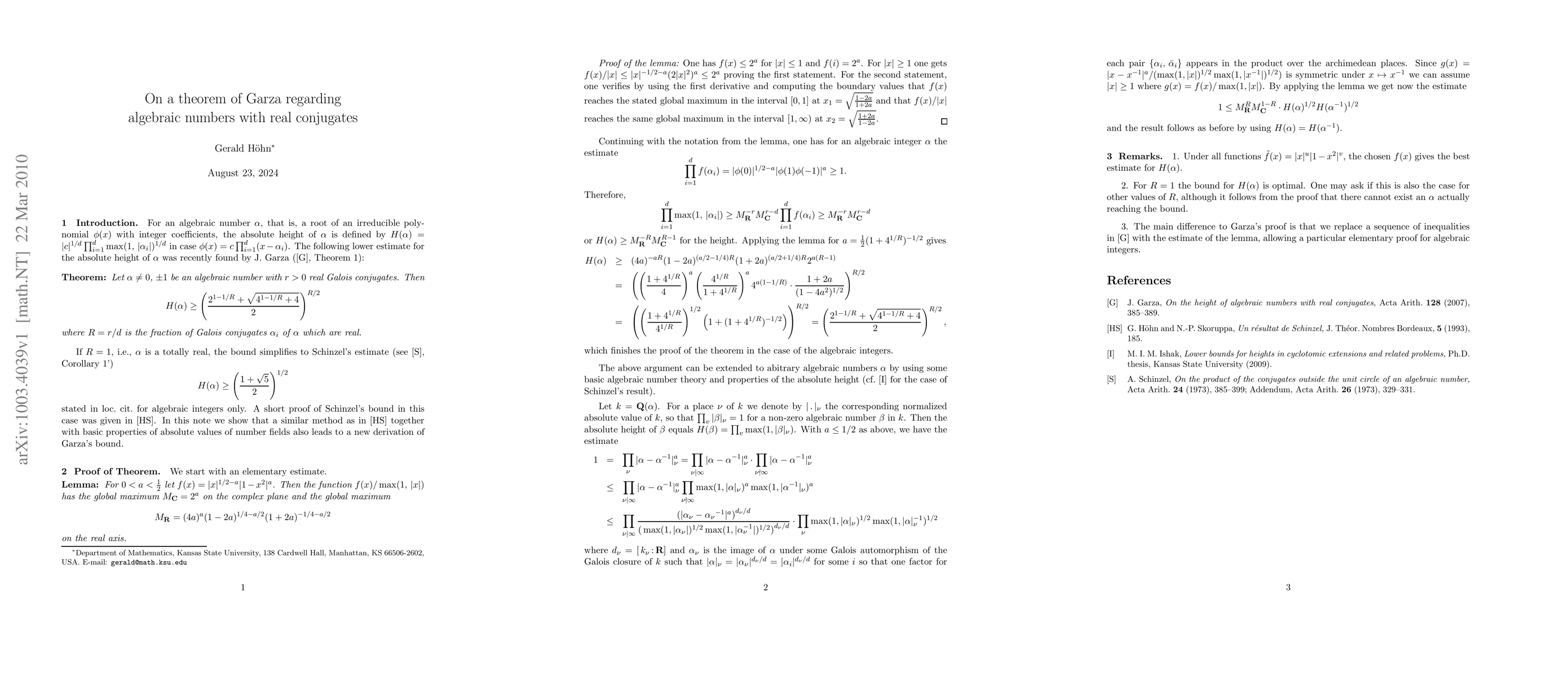 Summary: This paper presents a straightforward new proof for Garza's theorem that estimates the height (Mahler measure) of algebraic numbers having real conjugates. The new approach aims to simplify the existing proof method.