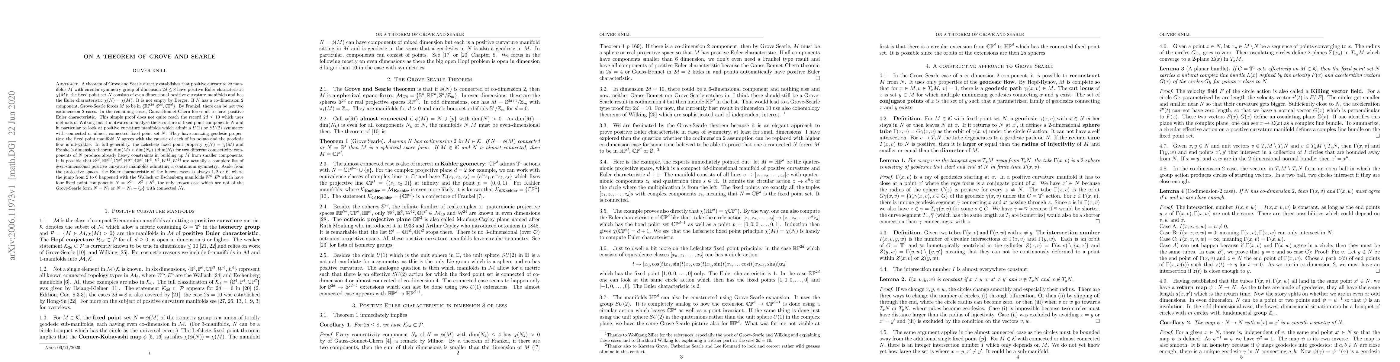 A theorem of Grove and Searle directly establishes that positive curvature 2d manifolds M with effective circular symmetry group of dimension 8 or less have positive Euler characteristic X(M): the fixed point set N consists of even dimensional positive curvature manifolds and has the Euler characteristic X(N)=X(M). It is not empty by Berger. If N has a co-dimension 2 component, Grove-Searle forces M to be in { RP^2d,S^2d,CP^d }. By Frankel, there can be not two codimension 2 cases. In the remaining cases, Gauss-Bonnet-Chern forces all to have positive Euler characteristic. This simple proof does not quite reach the record 10 or less which uses methods of Wilking but it motivates to analyze the structure of fixed point components N and in particular to look at positive curvature manifolds which admit a U(1) or SU(2) symmetry with connected or almost connected fixed point set N. They have amazing geodesic properties: the fixed point manifold N agrees with the caustic of each of its points and the geodesic flow is integrable. In full generality, the Lefschetz fixed point property X(N)=X(M) and Frankel's dimension theorem dim(M) is less than dim(A) + dim(B) for two different connectivity components A,B of N produce already heavy constraints in building up M from smaller components. It is possible that S^2d, RP^2d, CP^d, HP^d, OP^2, W^6,E^6,W^12,W^24 are actually a complete list of even-dimensional positive curvature manifolds admitting a continuum symmetry. Aside from the projective spaces, the Euler characteristic of the known cases is always 1,2 or 6, where the jump from 2 to 6 happened with the Wallach or Eschenburg manifolds W^6,E^6 which have four fixed point components N=S^2 + S^2 + S^0, the only known case which are not of the Grove-Searle form N=N_1 or N=N_1 + p} with connected N_1.