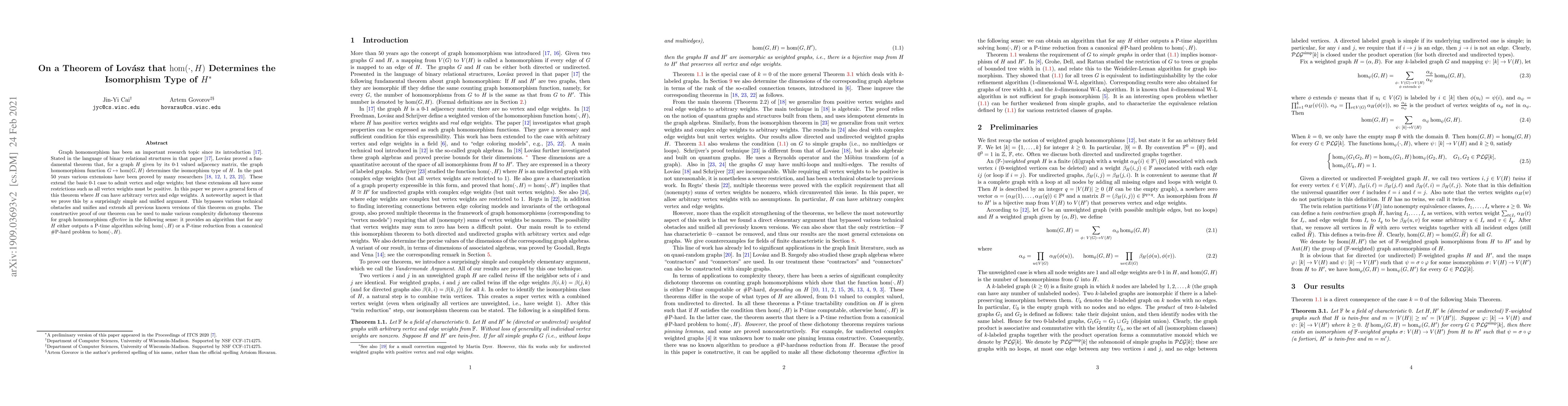 Graph homomorphism has been an important research topic since its introduction [17]. Stated in the language of binary relational structures in that paper [17], Lov\'asz proved a fundamental theorem that, for a graph $H$ given by its $0$-$1$ valued adjacency matrix, the graph homomorphism function $G \mapsto \hom(G, H)$ determines the isomorphism type of $H$. In the past 50 years various extensions have been proved by many researchers [18, 12, 1, 23, 21]. These extend the basic $0$-$1$ case to admit vertex and edge weights; but these extensions all have some restrictions such as all vertex weights must be positive. In this paper we prove a general form of this theorem where H can have arbitrary vertex and edge weights. A noteworthy aspect is that we prove this by a surprisingly simple and unified argument. This bypasses various technical obstacles and unifies and extends all previous known versions of this theorem on graphs. The constructive proof of our theorem can be used to make various complexity dichotomy theorems for graph homomorphism effective in the following sense: it provides an algorithm that for any $H$ either outputs a P-time algorithm solving $\hom(\cdot, H)$ or a P-time reduction from a canonical #P-hard problem to $\hom(\cdot, H)$.