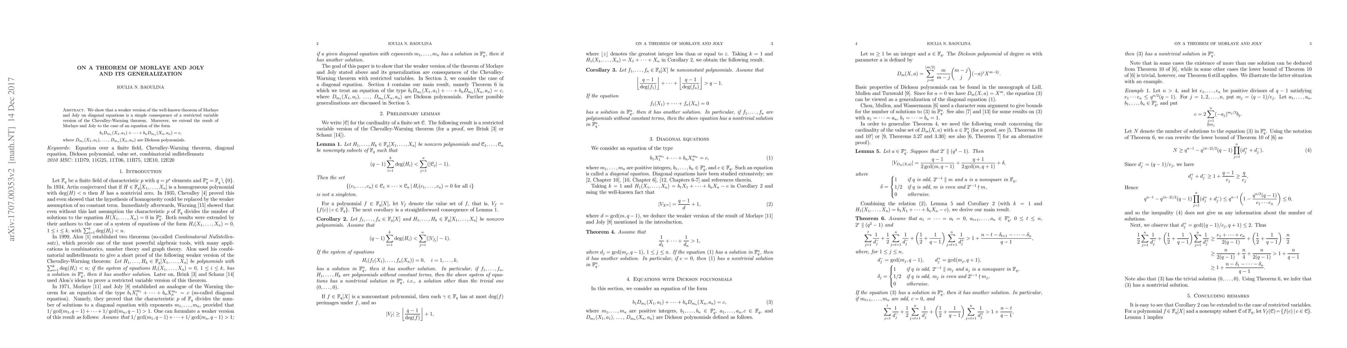 The paper extends a theorem of Morlaye and Joly to a generalized form involving Dickson polynomials, offering a simpler proof through the Chevalley-Warning theorem.
