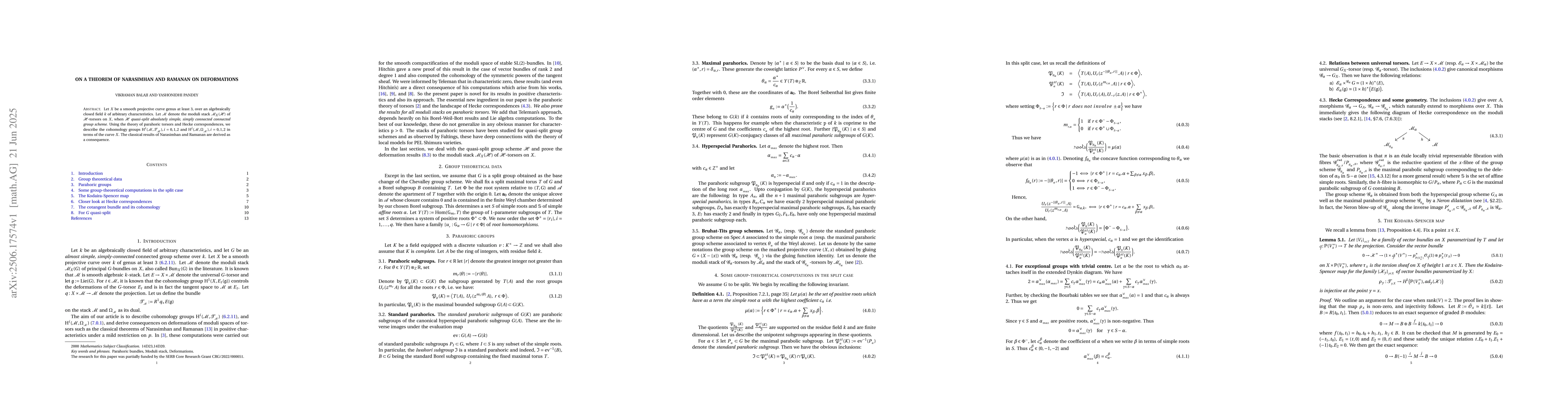 Let $X$ be a smooth projective curve genus at least $3$, over an algebraically closed field $k$ of arbitrary characteristics. Let $\cM$ denote the moduli stack $\cM_X(\cH)$ of $\cH$-torsors on $X$, when $\cH$ {\em quasi-split absolutely simple, simply connected connected group scheme}. Using the theory of parahoric torsors and Hecke correspondences, we describe the cohomology groups $\text{H}^i(\cM, \cT_{_{\cM}}), i = 0,1,2$ and $\text{H}^i(\cM, \Omega_{_{\cM}}), i = 0,1,2$ in terms of the curve $X$. The classical results of Narasimhan and Ramanan are derived as a consequence.