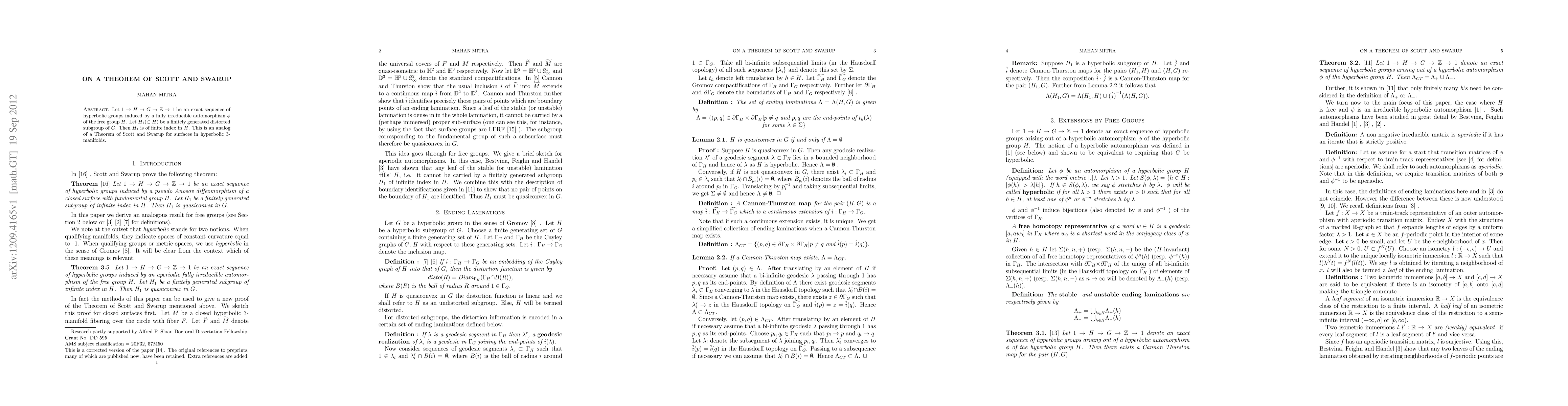 Let $1 \rightarrow H \rightarrow G \rightarrow \mathbb{Z} \rightarrow 1$ be an exact sequence of hyperbolic groups induced by a fully irreducible automorphism $\phi$ of the free group $H$. Let $H_1 (\subset H)$ be a finitely generated distorted subgroup of $G$. Then $H_1$ is of finite index in $H$. This is an analog of a Theorem of Scott and Swarup for surfaces in hyperbolic 3-manifolds.
