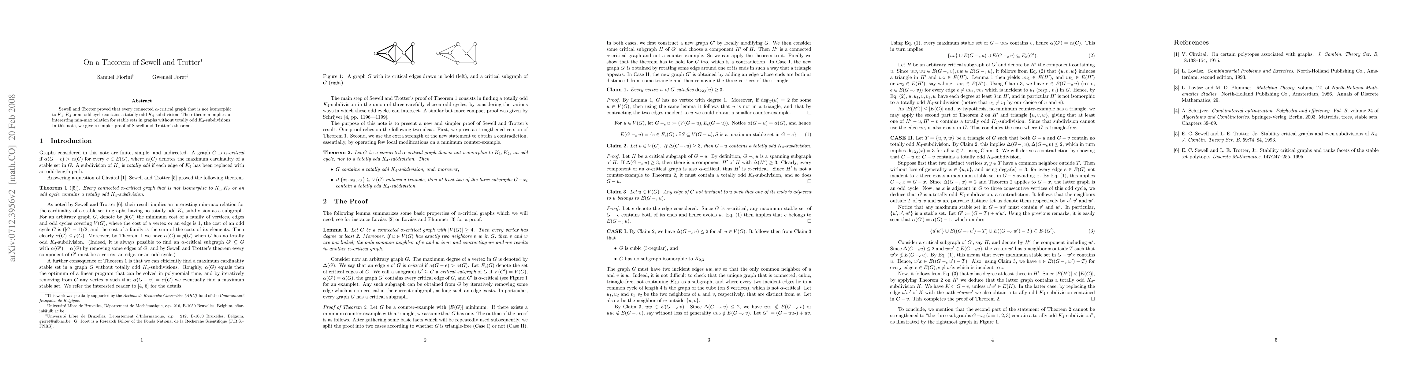 This paper provides a simpler proof for Sewell and Trotter's theorem, which asserts that every connected alpha-critical graph, excluding K_1, K_2, or an odd cycle, contains a totally odd K_4-subdivision, and highlights its implications for stable sets in such graphs.