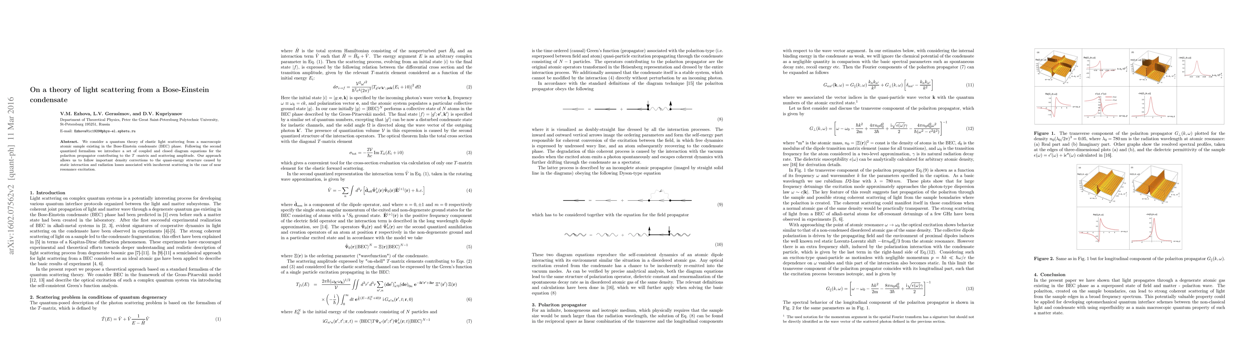 This paper develops a quantum theory for elastic light scattering from a Bose-Einstein condensate, introducing coupled diagram equations for the polariton propagator and addressing density corrections due to static interactions and radiation losses in near-resonance excitation.