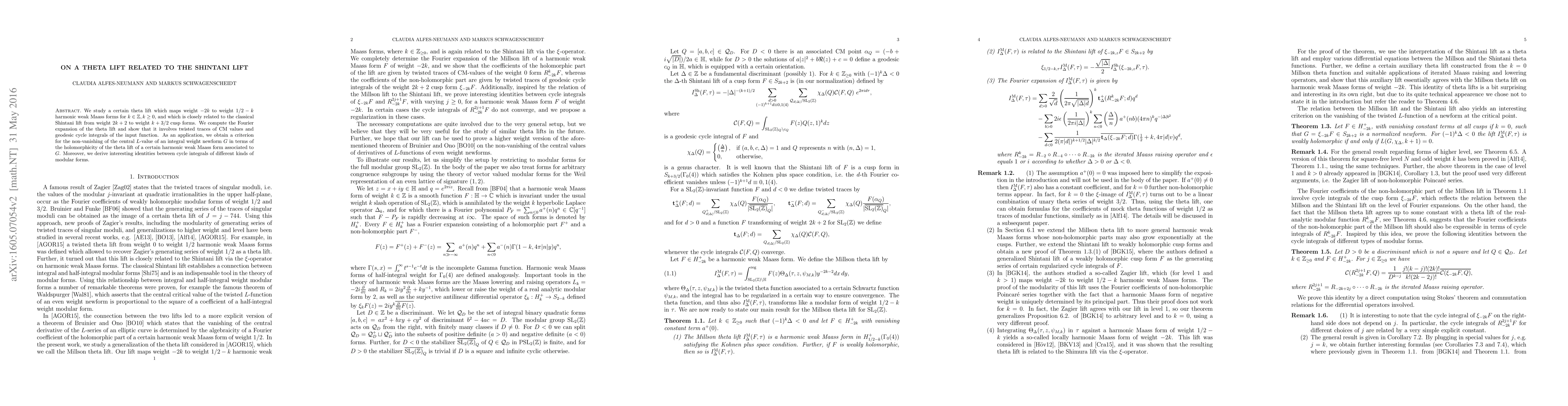 We study a certain theta lift which maps weight $-2k$ to weight $1/2-k$ harmonic weak Maass forms for $k \in \mathbb{Z}, k \geq 0$, and which is closely related to the classical Shintani lift from weight $2k+2$ to weight $k+3/2$ cusp forms. We compute the Fourier expansion of the theta lift and show that it involves twisted traces of CM values and geodesic cycle integrals of the input function. As an application, we obtain a criterion for the non-vanishing of the central $L$-value of an integral weight newform $G$ in terms of the holomorphicity of the theta lift of a certain harmonic weak Maass form associated to $G$. Moreover, we derive interesting identities between cycle integrals of different kinds of modular forms.