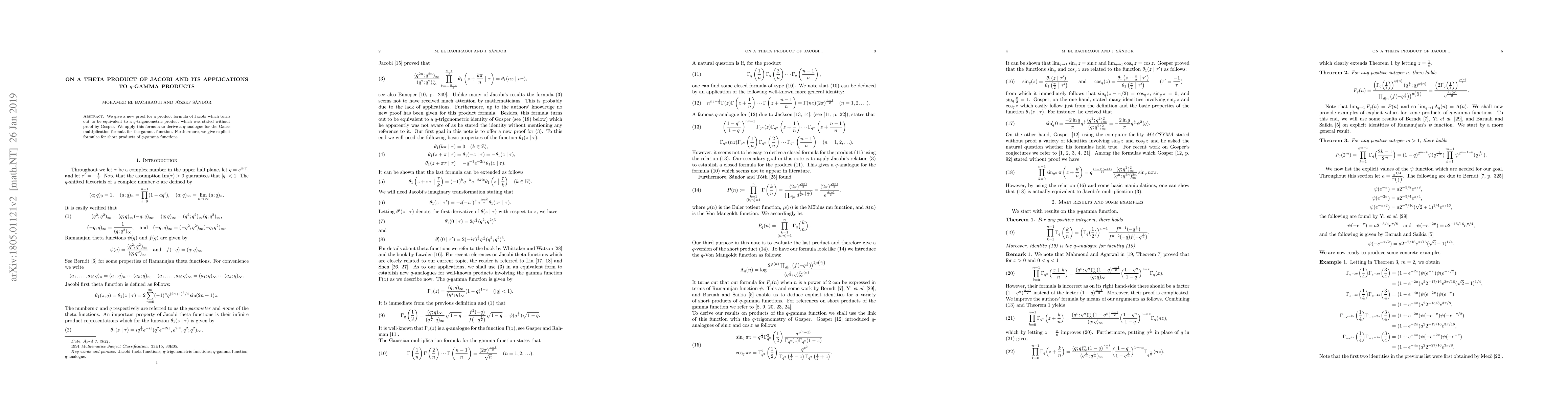 This paper presents a new proof for Jacobi's theta product formula, showing its equivalence to Gosper's $q$-trigonometric product. It also derives a $q$-analogue of the Gauss multiplication formula for the gamma function and provides explicit formulas for short products of $q$-gamma functions.