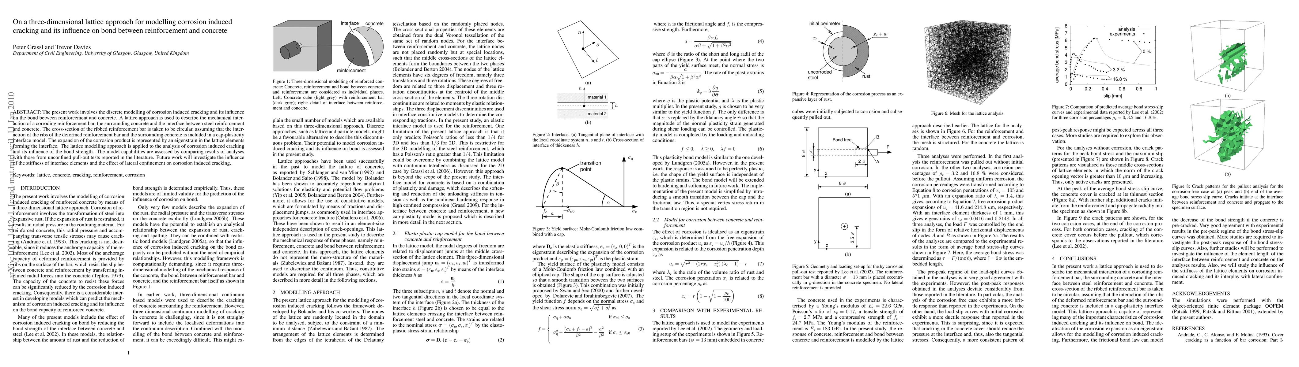 This paper presents a three-dimensional lattice model to simulate corrosion-induced cracking and its impact on the bond between reinforcement and concrete. The model uses a cap-plasticity interface to represent the interaction between the corroding reinforcement bar and surrounding concrete, with corrosion expansion represented as an eigenstrain.