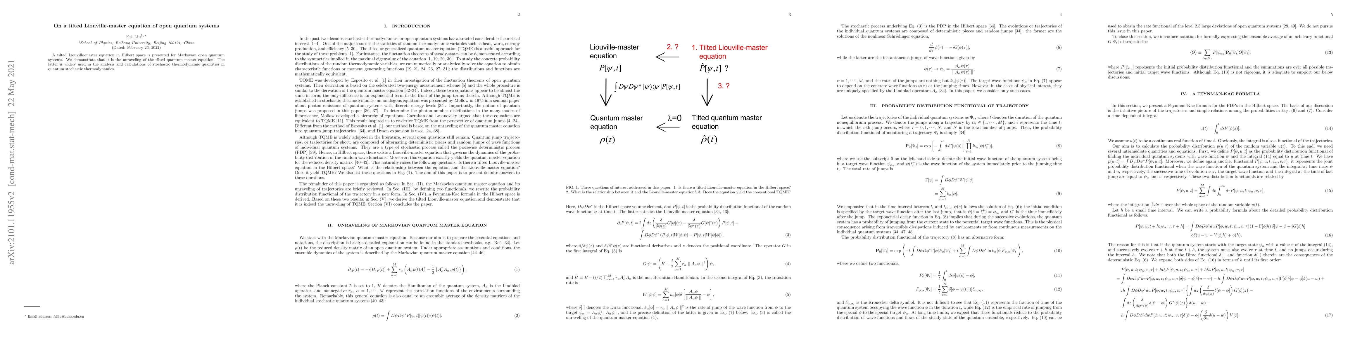 A tilted Liouville-master equation in Hilbert space is presented for Markovian open quantum systems. We demonstrate that it is the unraveling of the tilted quantum master equation. The latter is widely used in the analysis and calculations of stochastic thermodynamic quantities in quantum stochastic thermodynamics.