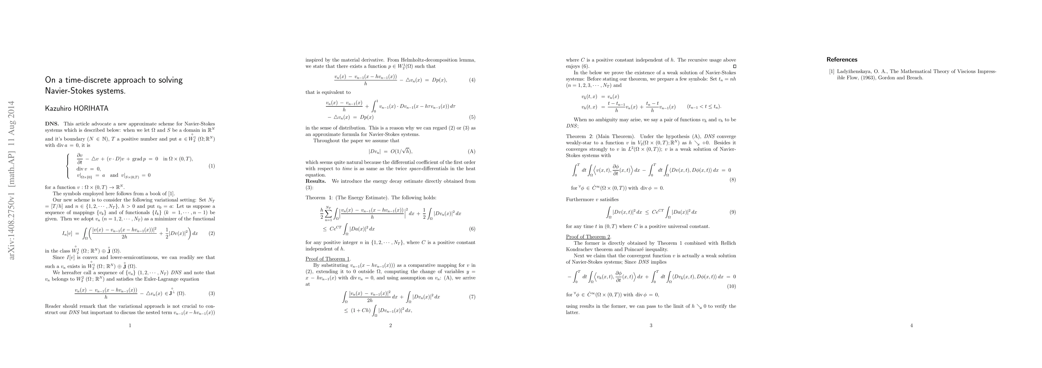 We present a new scheme for solving Navier-Stokes systems. This is inspired by material differentiation and combined with discrete Morse semi-flow. The solution has the first energy inequality, we set some assumption though. This result crucially does not provide any new result, but I believe that by making my scheme is more sophisticated, we can develop the study of Navier-Stokes systems.